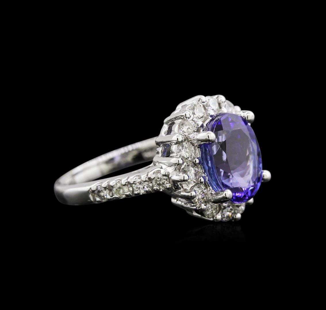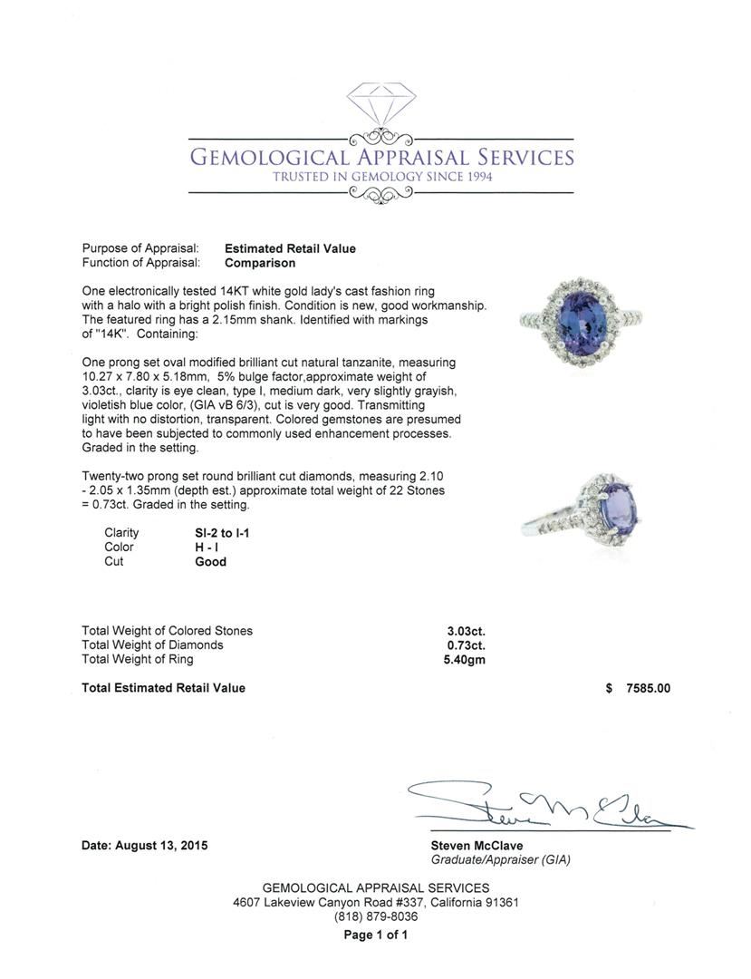 One electronically tested 14KT white gold lady's cast fashion ring with a halo with a bright polish finish. The featured ring has a 2.15mm shank. Identified with markings of "14K". Condition is new, good workmanship. Containing: One prong set oval modified brilliant cut natural tanzanite, measuring 10.27 x 7.80 x 5.18mm, 5% bulge factor, approximate weight of 3.03ct., clarity is eye clean, type I, medium dark, very slightly grayish, violetish blue color, (GIA vB 6/3), cut is very good. Transmitting light with no distortion, transparent. Colored gemstones are presumed to have been subjected to commonly used enhancement processes. Graded in the setting. Twenty-Two prong set round brilliant cut diamonds, measuring 2.10 - 2.05 x 1.35mm (depth est.) approximate total weight of 22 Stones = 0.73ct. Graded in the setting. Clarity: SI-2 to I-1. Color: H - I. Cut Good. Total Weight of Colored Stones 3.03ct. Total Weight of Diamonds 0.73ct. Total Weight of Ring 5.40gm. GAS Appraised at $7,585.00.