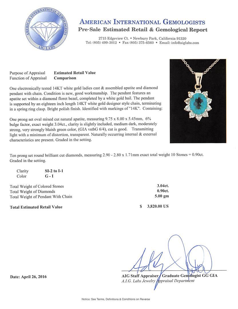 One electronically tested 14KT white gold ladies cast & assembled apatite and diamond pendant with chain. The pendant features an apatite set within a diamond floret bezel, completed by a white gold bail. The pendant is supported by an eighteen inch length 14KT white gold designer style chain, terminating in a spring ring clasp. Bright polish finish. Identified with markings of "14K". Condition is new, good workmanship. Containing: One prong set oval mixed cut natural apatite, measuring 9.75 x 8.00 x 5.45mm, 6%. bulge factor, exact weight 3.04ct., clarity is slightly included, medium dark, moderately strong, very strongly bluish green color, (GIA vstbG 6/4), cut is good. Transmitting light with a minimum of distortion, transparent. Naturally occurring internal & external characteristics are present. Graded in the setting. Ten prong set round brilliant cut diamonds, measuring 2.90 - 2.80 x 1.71mm exact total weight 10 Stones = 0.90ct. Graded in the setting. Clarity: SI-2 to I-1. Color: G - I. Total Weight of Colored Stones 3.04ct. Total Weight of Diamonds 0.90ct. Total Weight of Pendant With Chain 5.00gm. AIG Appraised at $3,820.00.