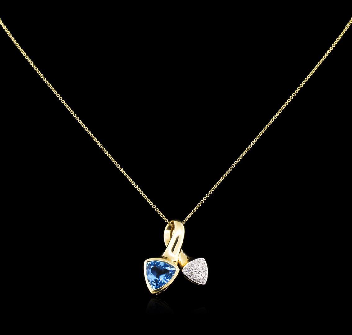One pendant with chain featuring: 14KT yellow gold weighing 5.60 grams containing one blue topaz with a total weight of 3.04ct and diamonds with a total weight of 0.10ct.