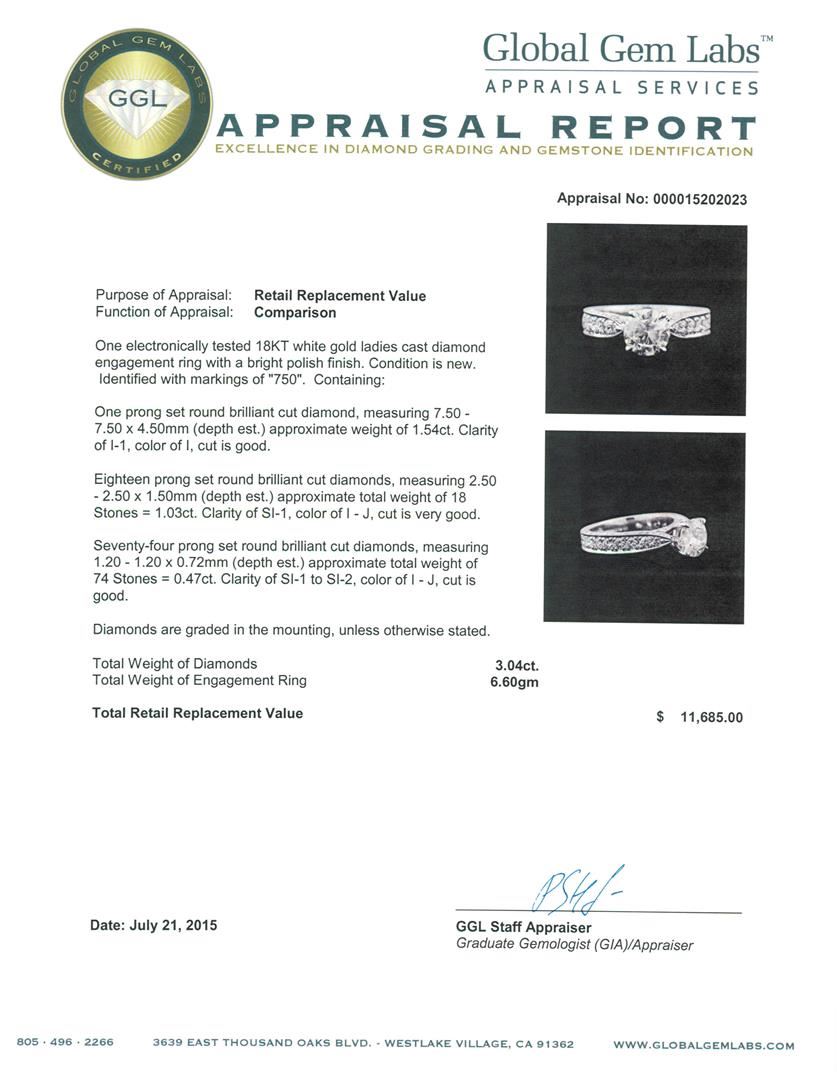 One electronically tested 18KT white gold ladies cast diamond engagement ring with a bright polish finish. Identified with markings of "750". Condition is new. Containing: One prong set round brilliant cut diamond, measuring 7.50 - 7.50 x 4.50mm (depth est.) approximate weight of 1.54ct. Clarity: I-1. Color: I, Cut is Good. Eighteen prong set round brilliant cut diamonds, measuring 2.50 - 2.50 x 1.50mm (depth est.) approximate total weight of 18 Stones = 1.03ct. Clarity: SI-1. Color: I - J, Cut is Very Good. Seventy-Four prong set round brilliant cut diamonds, measuring 1.20 - 1.20 x 0.72mm (depth est.) approximate total weight of 74 Stones = 0.47ct. Clarity: SI-1 to SI-2. Color: I - J, Cut is Good. Diamonds are graded in the mounting, unless otherwise stated. Total Weight of Diamonds 3.04ct. Total Weight of Engagement Ring 6.60gm. GGL Appraised at $11,685.00.