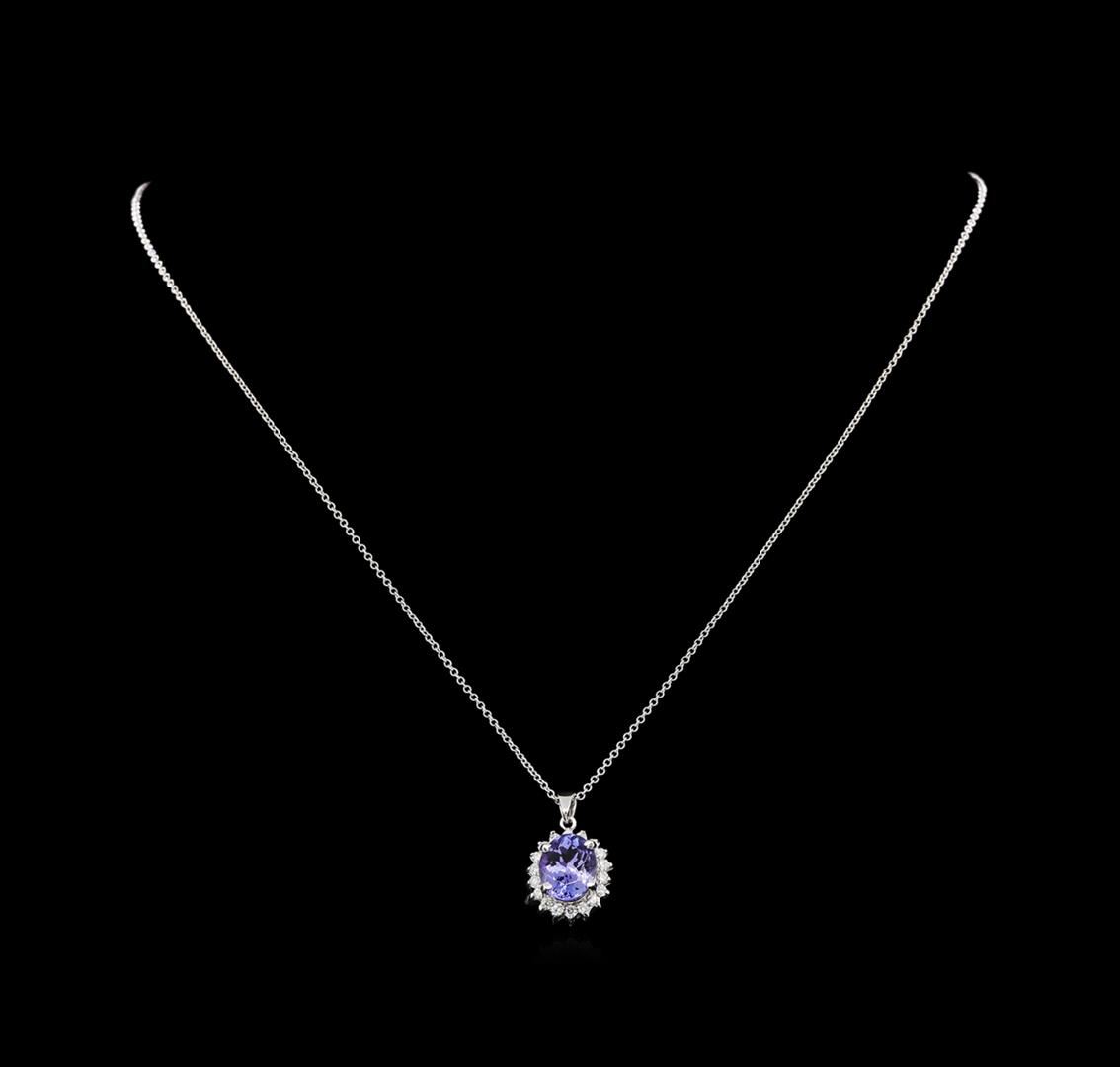One electronically tested 14KT white gold lady's combination cast & assembled fashion pendant & chain 18.0' long, 1.3mm round cable link with a lobster claw clasp with a bright polish finish. The featured lady's pendant and chain has a drop measuring 20 millimeters in length. Identified with markings of '14K'. Condition is new, good workmanship. Containing: Eighteen prong set round brilliant cut diamonds, measuring 1.85 - 1.75 x 1.12mm (depth est.) approximate total weight of 18 Stones = 0.40ct. Graded in the setting. Clarity SI-1 to SI-2. Color: G - H Cut Good One prong set oval modified brilliant cut natural tanzanite, measuring 10.35 x 8.36 x 5.22mm, (depth est.) approximate weight of 3.05ct., clarity is eye clean, medium light, very slightly grayish, bluish violet color, (GIA bV 4/3), cut is good. Transmitting light with no distortion, transparent. Colored gemstones are presumed to have been subjected to commonly used enhancement processes. Graded in the setting. Total Weight of Colored Stones 3.05ct.. Total Weight of Diamonds 0.40ct.. Total Weight of Pendant & Chain 5.20gm. GAS Appraised at $4,905.00.