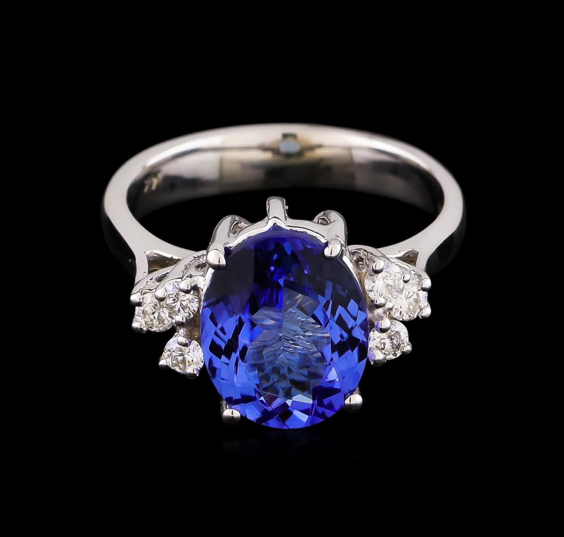 One electronically tested 14KT white gold lady's cast fashion ring with a basket setting with a bright polish finish. The featured lady's ring has a shank measuring 3.36 millimeters wide. Identified with markings of "14K". Condition is new, good workmanship. Containing: One prong set oval modified brilliant cut natural tanzanite, measuring 10.45 x 8.46 x 4.61mm, 7%. bulge factor, approximate weight of 3.05ct., clarity is eye clean, medium, very slightly grayish, violetish blue color, (GIA vB 5/3), cut is very good. Transmitting light with no distortion, transparent. Colored gemstones are presumed to have been subjected to commonly used enhancement processes. Graded in the setting. Six prong set round brilliant cut diamonds, measuring 2.30 - 2.20 x 1.35mm (depth est.) approximate total weight of 6 Stones = 0.25ct. Graded in the setting. Clarity: SI-1 to SI-2. Color: H - I. Cut Good. Total Weight of Colored Stones 3.05ct. Total Weight of Diamonds 0.25ct. Total Weight of Ring 4.80gm. GAS Appraised at $6,045.00.