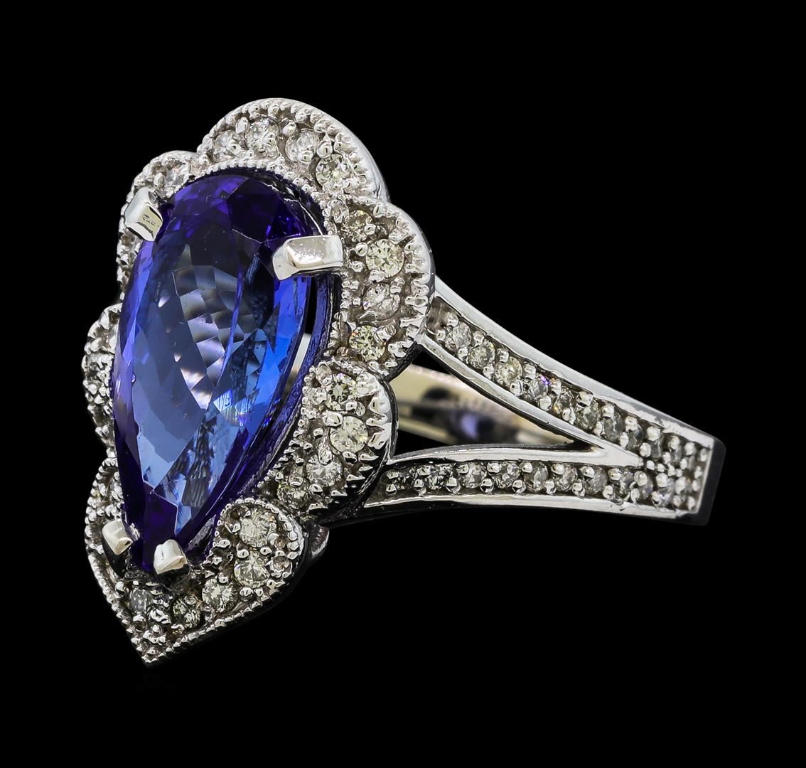 One electronically tested 14KT white gold lady's cast fashion ring with a split shank scalloped basket halo with a bright polish with milgrain detailing finish. The featured lady's ring has a shank measuring 2.63 millimeters wide. Identified with markings of 'K14'. Condition is new, good workmanship. Containing: One prong set pear modified brilliant cut natural tanzanite, measuring 13.30 x 7.05 x 4.71mm, (depth est.) approximate weight of 3.05ct., clarity is eye clean, medium, moderately strong, violetish blue color, (GIA vB 5/4), cut is very good. Transmitting light with no distortion, transparent. Colored gemstones are presumed to have been subjected to commonly used enhancement processes. Graded in the setting. Twenty-Eight prong set round brilliant cut diamonds, measuring 1.30 - 1.25 x 0.79mm (depth est.) approximate total weight of 28 Stones = 0.22ct. Graded in the setting. Clarity SI-1 to SI-2. Color: H - I Cut Good Forty-Four prong set round brilliant cut diamonds, measuring 1.15 - 1.05 x 0.68mm (depth est.) approximate total weight of 44 Stones = 0.22ct. Graded in the setting. Clarity SI-1 to SI-2. Color: H - I Cut Good. Total Weight of Colored Stones 3.05ct.. Total Weight of Diamonds 0.44ct.. Total Weight of Ring 7.30gm. GAS Appraised at $7,660.00.