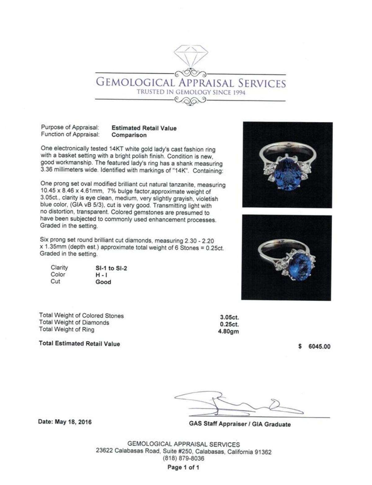 One electronically tested 14KT white gold lady's cast fashion ring with a basket setting with a bright polish finish. The featured lady's ring has a shank measuring 3.36 millimeters wide. Identified with markings of "14K". Condition is new, good workmanship. Containing: One prong set oval modified brilliant cut natural tanzanite, measuring 10.45 x 8.46 x 4.61mm, 7%. bulge factor, approximate weight of 3.05ct., clarity is eye clean, medium, very slightly grayish, violetish blue color, (GIA vB 5/3), cut is very good. Transmitting light with no distortion, transparent. Colored gemstones are presumed to have been subjected to commonly used enhancement processes. Graded in the setting. Six prong set round brilliant cut diamonds, measuring 2.30 - 2.20 x 1.35mm (depth est.) approximate total weight of 6 Stones = 0.25ct. Graded in the setting. Clarity: SI-1 to SI-2. Color: H - I. Cut Good. Total Weight of Colored Stones 3.05ct. Total Weight of Diamonds 0.25ct. Total Weight of Ring 4.80gm.