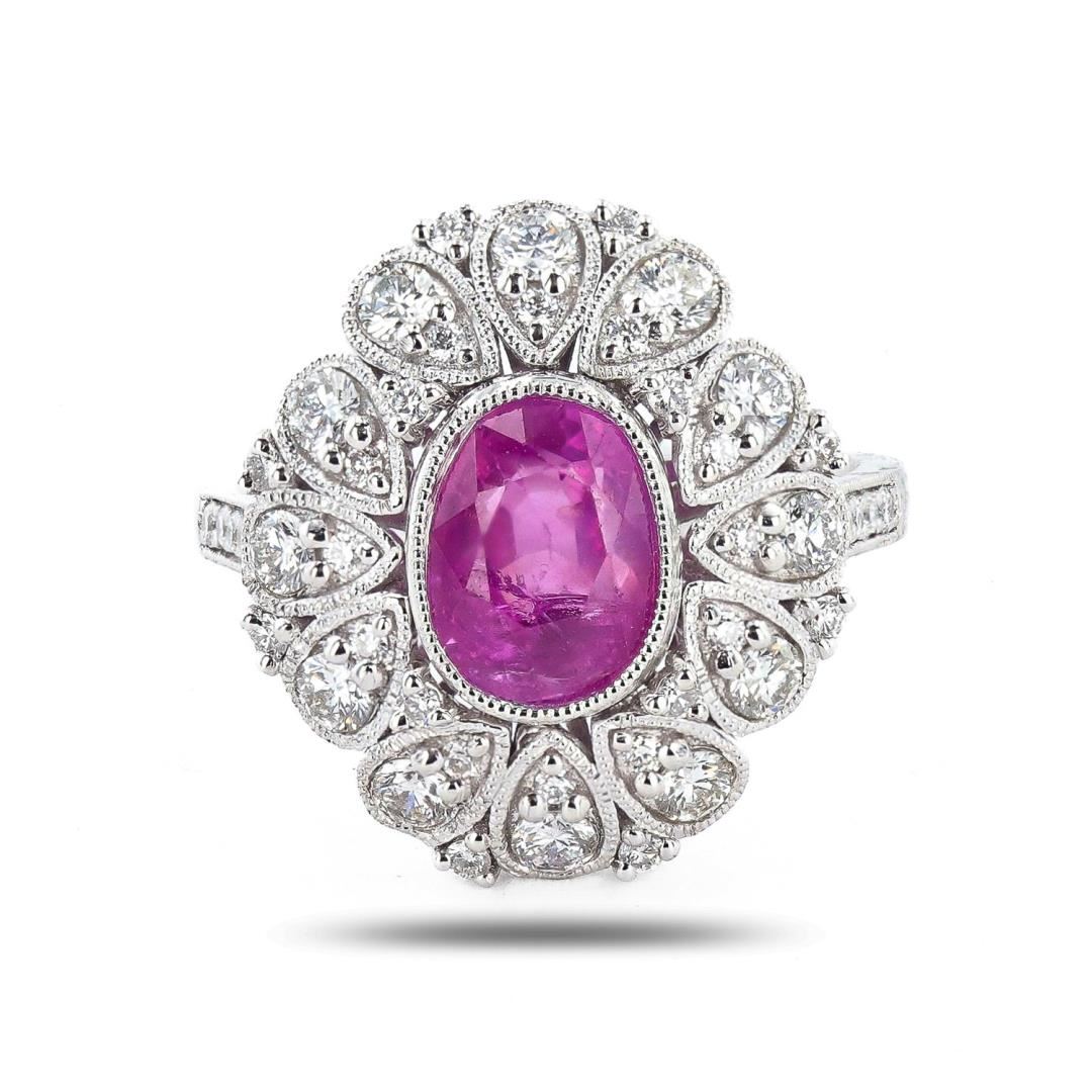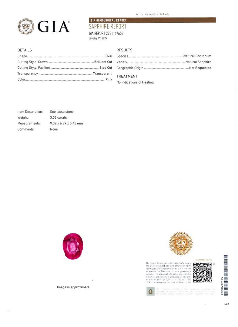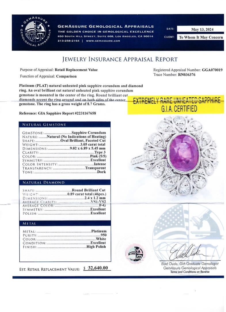 Platinum (PLAT) natural unheated pink sapphire corundum and diamond ring. An oval brilliant cut natural unheated pink sapphire corundum gemstone is mounted in the center of the ring. Round brilliant cut diamonds accent the ring around and on bath sides of he center gemstone. The ring has a gross weight of 8.7 Grams. Reference: GIA Sapphire Report 2231167658 Brand: Oscar Friedman #NATURAL GEMSTONE# GEMSTONE: Sapphire Corundum NATURE: Natural (No Indications of Heating) SHAPE: Oval Brilliant, Faceted Cut WEIGHT: 3.05 carat total DIMENSIONS: 9.02 x 6.89 x 5.45mm CLARITY: Type 3 COLOR: Pink (5/5) SYMMETRY: Excellent COLOR INTENSITY: Intense TRANSPARENCY: Transparent TONE: Dark #NATURAL DIAMOND# SHAPE: Round Brilliant Cut WEIGHT: 0.89 carat total (46pcs.) DIMENSIONS: 2.4 x 1.2mm AVERAGE CLARITY: VS1-VS2 AVERAGE COLOR: F-G SYMMETRY: Excellent POLISH: Excellent #METAL# METAL: Platinum PURITY: 950 COLOR: White CONDITION: Excellent FINISH: High Polish Size: 6 3/4