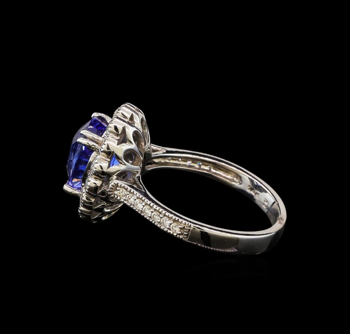 One electronically tested 14KT white gold lady's cast fashion ring with a basket halo with a bright polish with milgrain detailing finish. The featured lady's ring has a shank measuring 2.61 millimeters wide. Identified with markings of '14K'. Condition is new, good workmanship. Containing: One prong set pear modified brilliant cut natural blue sapphire, measuring 9.55 x 7.13 x 6.19mm, (depth est.) approximate weight of 3.06ct., clarity is eye clean, medium, moderately strong, blue color, (GIA B 5/4), cut is very good. Transmitting light with no distortion, transparent. Colored gemstones are presumed to have been subjected to commonly used enhancement processes. Graded in the setting. Fourteen prong set round brilliant cut diamonds, measuring 1.60 - 1.50 x 0.96mm (depth est.) approximate total weight of 14 Stones = 0.20ct. Graded in the setting. Clarity VS-2 to SI-1. Color: H - I Cut Good Fourteen prong set round brilliant cut diamonds, measuring 1.30 - 1.20 x 0.76mm (depth est.) approximate total weight of 14 Stones = 0.10ct. Graded in the setting. Clarity VS-2 to SI-1. Color: H - I Cut Good. Total Weight of Colored Stones 3.06ct.. Total Weight of Diamonds 0.30ct.. Total Weight of Ring 5.10gm. GAS Appraised at $12,755.00.