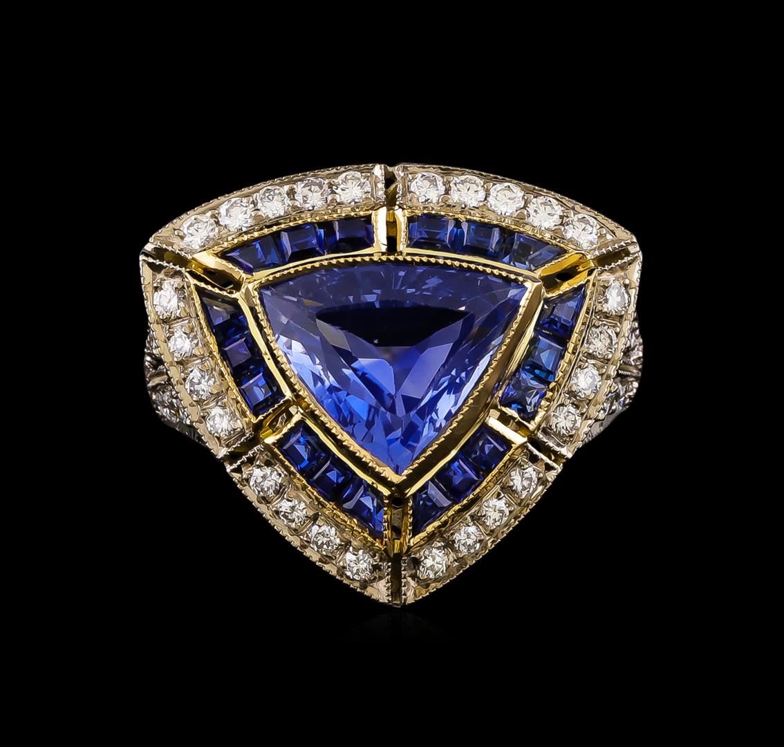 One electronically tested 18KT yellow gold ladies cast sapphire and diamond ring. The featured sapphire is set within a sapphire and diamond bezel supported by a filigree lattice under gallery and diamond set shoulders, completed by a two millimeter wide band. Bright polish finish with milgrain detailing and rhodium accents. Identified with markings of '18K'. Condition is good. Containing: One prong set triangle mixed cut natural blue sapphire, measuring 9.20 x 8.30 x 4.20mm, approximate weight of 2.50ct., clarity is slightly included, type II, medium, slightly grayish, violetish blue color, (GIA vB 5/2), cut is good. Transmitting light with a minimum of distortion, transparent. Naturally occurring internal & external characteristics are present. Graded in the setting. Eighteen channel set square and trapezoid step cut natural blue sapphires approximate total weight of 0.56ct., clarity is eye clean, type II, medium dark, very slightly grayish, blue color, (GIA B 6/3), cut is good. Transmitting light with no distortion, transparent. Color grade is an average for the group. Graded in the setting. Thirty-Eight prong set round brilliant and single cut diamonds approximate total weight of 38 Stones = 0.44ct. The color grade reflects the entire range of clarity for this group. Graded in the setting. Clarity SI-1 to I-2. Color: F - H. Total Weight of Colored Stones 3.06ct.. Total Weight of Diamonds 0.44ct.. Total Weight of Ring 6.02gm. AIG Appraised at $5,355.00.