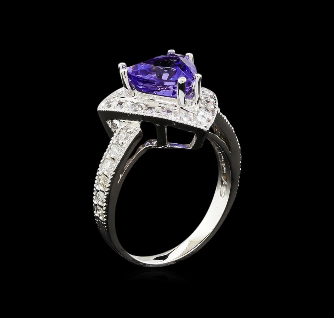 One electronically tested 14KT white gold lady's cast fashion ring with a cathedral shank with a bright polish with milgrain detailing finish. The featured lady's ring has a shank measuring 2.57 millimeters wide. Identified with markings of "K14". Condition is new, good workmanship. Containing: One prong set triangle modified brilliant cut natural tanzanite, measuring 9.30 x 9.10 x 5.86mm, approximate weight of 3.06ct., clarity is eye clean, type I, medium, very slightly grayish, bluish violet color, (GIA bV 5/3), cut is very good. Transmitting light with no distortion, transparent. Colored gemstones are presumed to have been subjected to commonly used enhancement processes. Graded in the setting. Thirty prong set round brilliant cut diamonds, measuring 1.90 - 1.80 x 1.17mm (depth est.) approximate total weight of 30 Stones = 0.74ct. Graded in the setting. Clarity: SI-1 to I-1. Color: H - I. Cut Good. Total Weight of Colored Stones 3.06ct. Total Weight of Diamonds 0.74ct. Total Weight of Ring 5.60gm. GAS Appraised at $7,725.00.