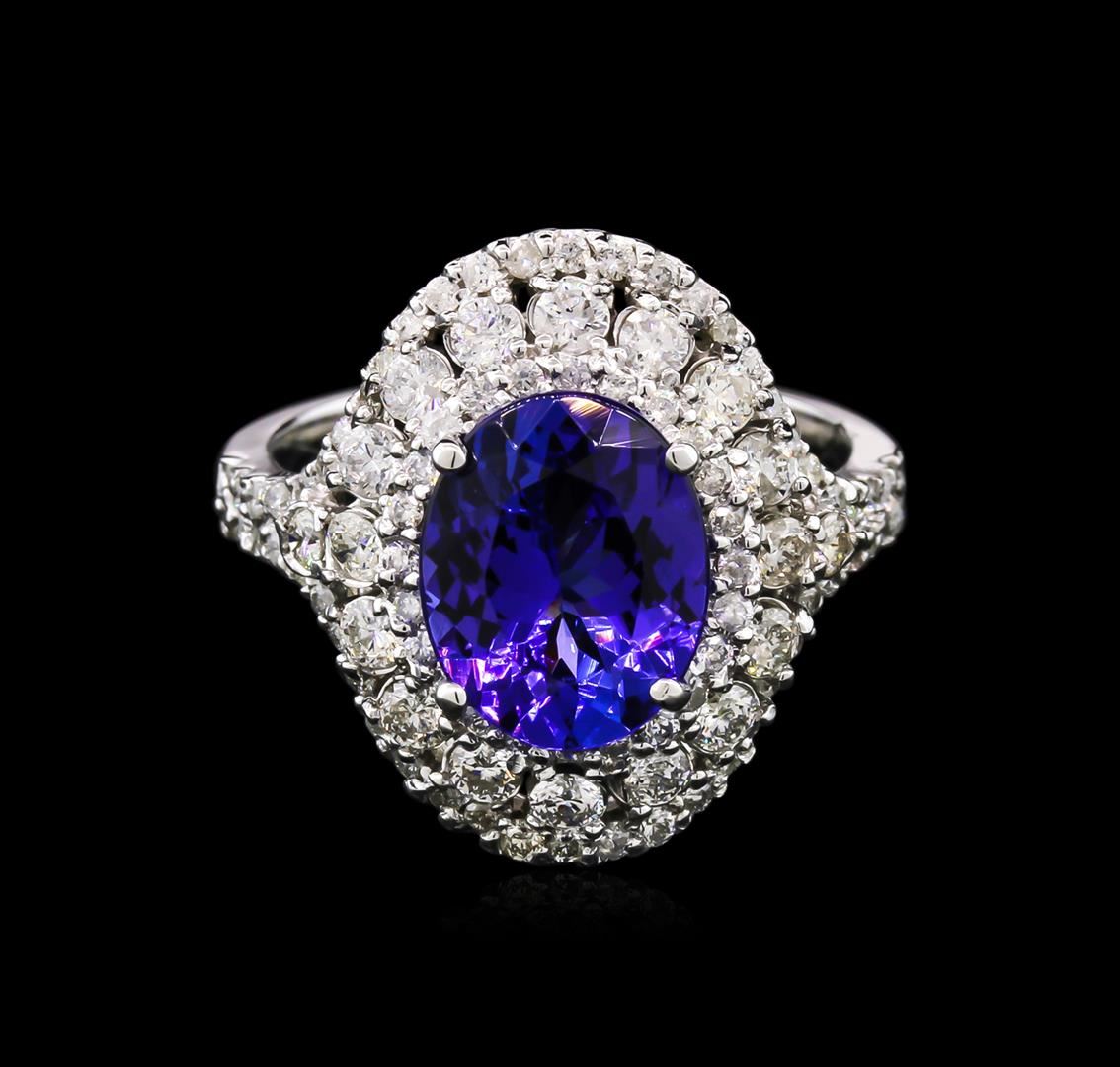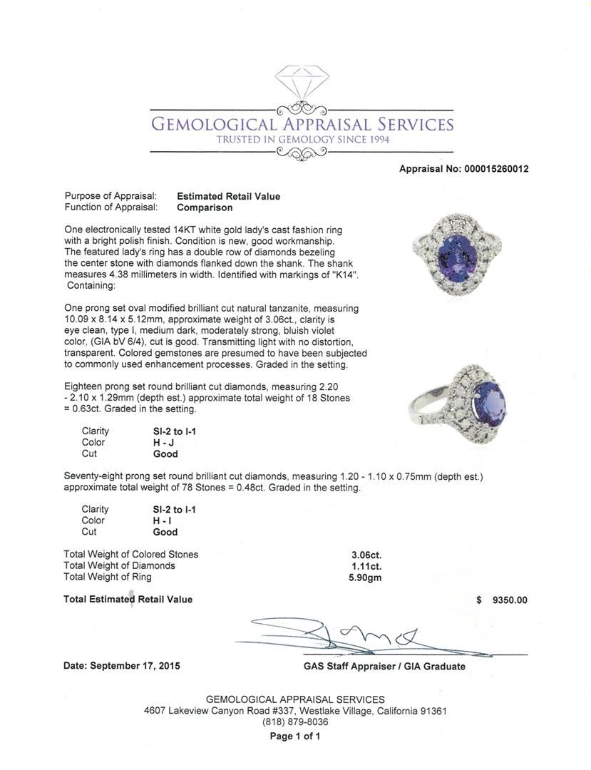 One electronically tested 14KT white gold lady's cast fashion ring with a bright polish finish. The featured lady's ring has a double row of diamonds bezeling the center stone with diamonds flanked down the shank. The shank measures 4.38 millimeters in width. Identified with markings of "K14". Condition is new, good workmanship. Containing: One prong set oval modified brilliant cut natural tanzanite, measuring 10.09 x 8.14 x 5.12mm, approximate weight of 3.06ct., clarity is eye clean, type I, medium dark, moderately strong, bluish violet color, (GIA bV 6/4), cut is good. Transmitting light with no distortion, transparent. Colored gemstones are presumed to have been subjected to commonly used enhancement processes. Graded in the setting. Eighteen prong set round brilliant cut diamonds, measuring 2.20 - 2.10 x 1.29mm (depth est.) approximate total weight of 18 Stones = 0.63ct. Graded in the setting. Clarity: SI-2 to I-1. Color: H - Good Seventy-Eight prong set round brilliant cut diamonds, measuring 1.20 - 1.10 x 0.75mm (depth est.) approximate total weight of 78 Stones = 0.48ct. Graded in the setting. Clarity: SI-2 to I-1. Color: H - I. Cut Good. Total Weight of Colored Stones 3.06ct. Total Weight of Diamonds 1.11ct. Total Weight of Ring 5.90gm. GAS Appraised at $9,350.00.