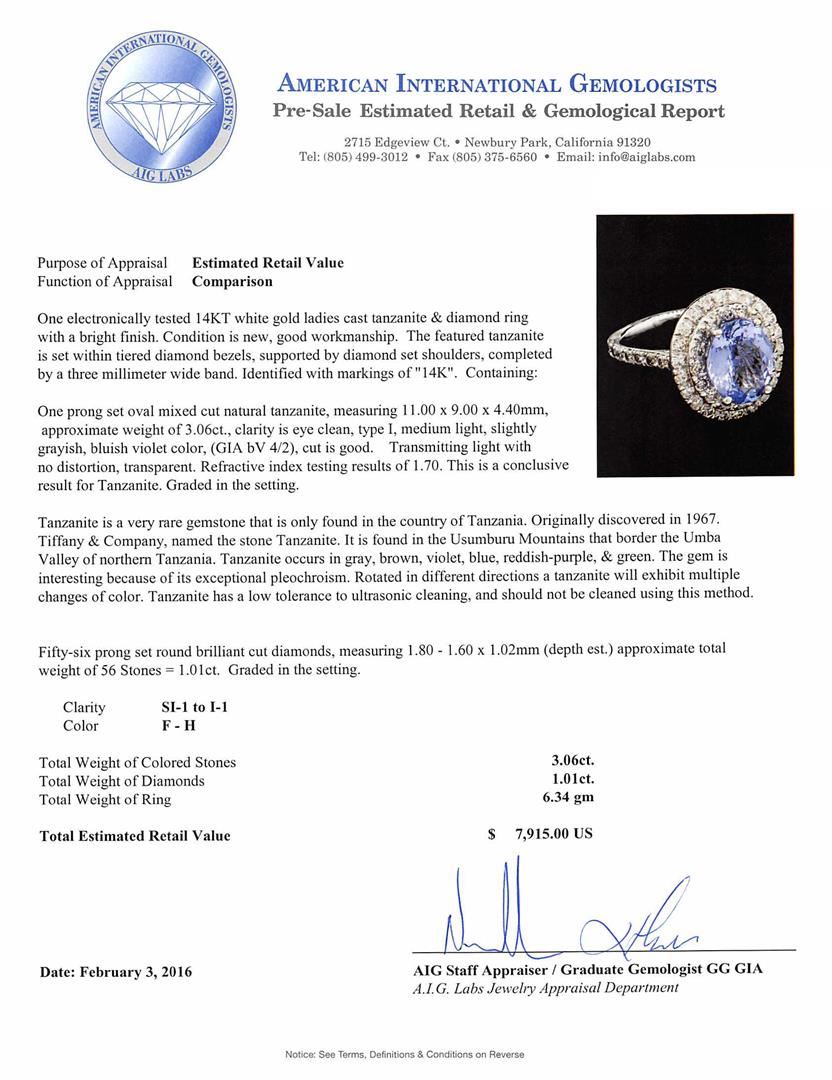 One electronically tested 14KT white gold ladies cast tanzanite & diamond ring with a bright finish. The featured tanzanite is set within tiered diamond bezels, supported by diamond set shoulders, completed by a three millimeter wide band. Identified with markings of "14K". Condition is new, good workmanship. Containing: One prong set oval mixed cut natural tanzanite, measuring 11.00 x 9.00 x 4.40mm, approximate weight of 3.06ct., clarity is eye clean, type I, medium light, slightly grayish, bluish violet color, (GIA bV 4/2), cut is good. Transmitting light with no distortion, transparent. Refractive index testing results of 1.70. This is a conclusive result for Tanzanite. Graded in the setting. Tanzanite is a very rare gemstone that is only found in the country of Tanzania. Originally discovered in 1967. Tiffany & Company, named the stone Tanzanite. It is found in the Usumburu Mountains that border the Umba Valley of northern Tanzania. Tanzanite occurs in gray, brown, violet, blue, reddish-purple, & green. The gem is interesting because of its exceptional pleochroism. Rotated in different directions a tanzanite will exhibit multiple changes of color. Tanzanite has a low tolerance to ultrasonic cleaning, and should not be cleaned using this method. Fifty-Six prong set round brilliant cut diamonds, measuring 1.80 - 1.60 x 1.02mm (depth est.) approximate total weight of 56 Stones = 1.01ct. Graded in the setting. Clarity: SI-1 to I-1. Color: F - H. Total Weight of Colored Stones 3.06ct. Total Weight of Diamonds 1.01ct. Total Weight of Ring 6.34gm. AIG Appraised at $7,915.00.