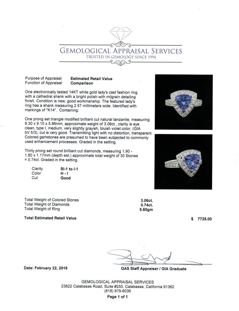 One electronically tested 14KT white gold lady's cast fashion ring with a cathedral shank with a bright polish with milgrain detailing finish. The featured lady's ring has a shank measuring 2.57 millimeters wide. Identified with markings of "K14". Condition is new, good workmanship. Containing: One prong set triangle modified brilliant cut natural tanzanite, measuring 9.30 x 9.10 x 5.86mm, approximate weight of 3.06ct., clarity is eye clean, type I, medium, very slightly grayish, bluish violet color, (GIA bV 5/3), cut is very good. Transmitting light with no distortion, transparent. Colored gemstones are presumed to have been subjected to commonly used enhancement processes. Graded in the setting. Thirty prong set round brilliant cut diamonds, measuring 1.90 - 1.80 x 1.17mm (depth est.) approximate total weight of 30 Stones = 0.74ct. Graded in the setting. Clarity: SI-1 to I-1. Color: H - I. Cut Good. Total Weight of Colored Stones 3.06ct. Total Weight of Diamonds 0.74ct. Total Weight of Ring 5.60gm. GAS Appraised at $7,725.00.