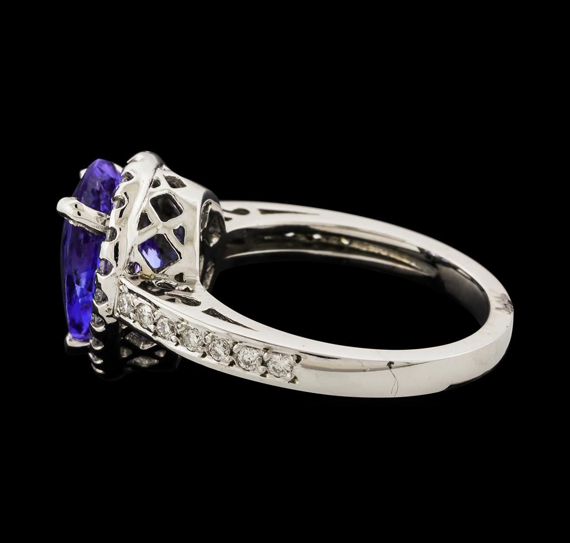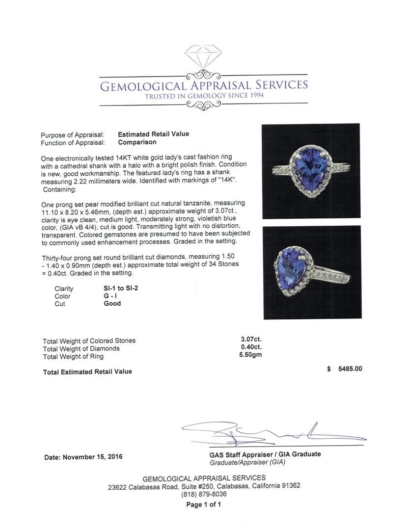 One electronically tested 14KT white gold lady's cast fashion ring with a cathedral shank with a halo with a bright polish finish. The featured lady's ring has a shank measuring 2.22 millimeters wide. Identified with markings of '14K'. Condition is new, good workmanship. Containing: One prong set pear modified brilliant cut natural tanzanite, measuring 11.10 x 8.20 x 5.46mm, (depth est.) approximate weight of 3.07ct., clarity is eye clean, medium light, moderately strong, violetish blue color, (GIA vB 4/4), cut is good. Transmitting light with no distortion, transparent. Colored gemstones are presumed to have been subjected to commonly used enhancement processes. Graded in the setting. Thirty-Four prong set round brilliant cut diamonds, measuring 1.50 - 1.40 x 0.90mm (depth est.) approximate total weight of 34 Stones = 0.40ct. Graded in the setting. Clarity SI-1 to SI-2. Color: G - I Cut Good. Total Weight of Colored Stones 3.07ct.. Total Weight of Diamonds 0.40ct.. Total Weight of Ring 5.50gm. GAS Appraised at $5,485.00.