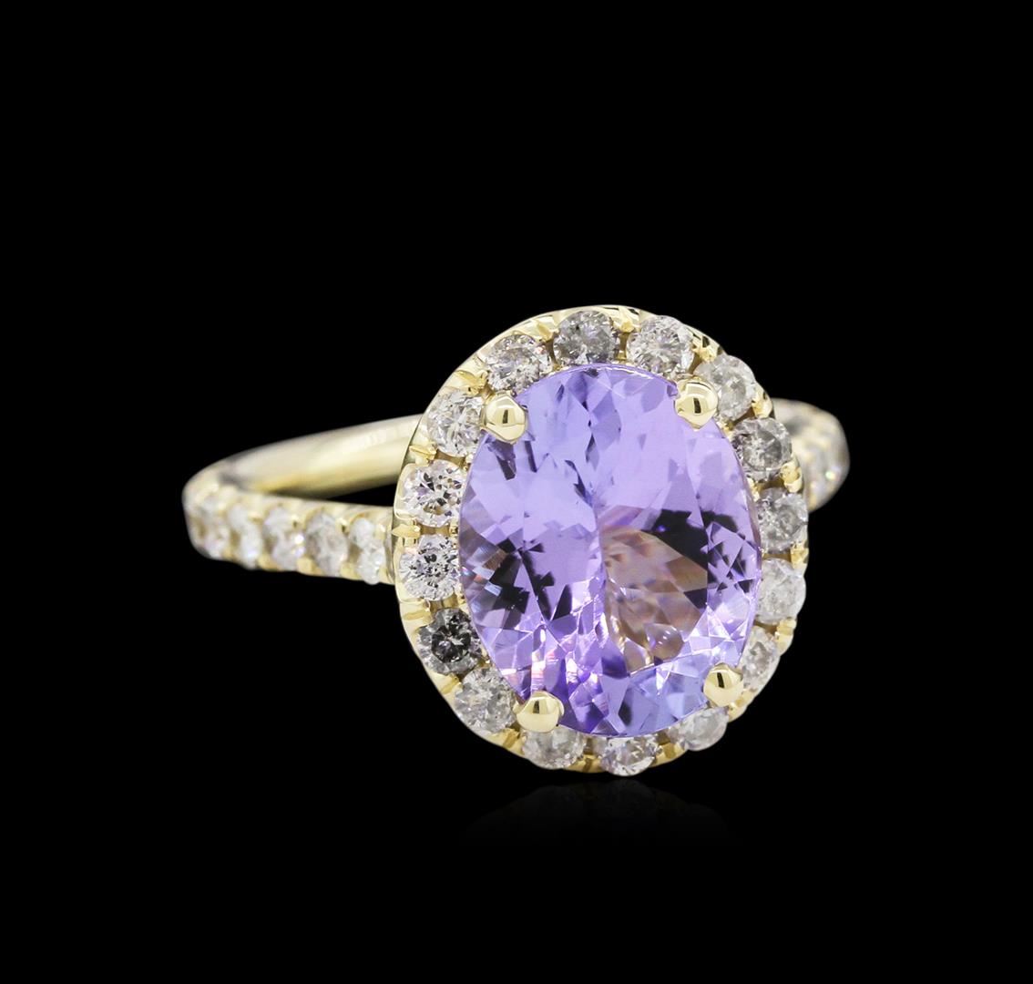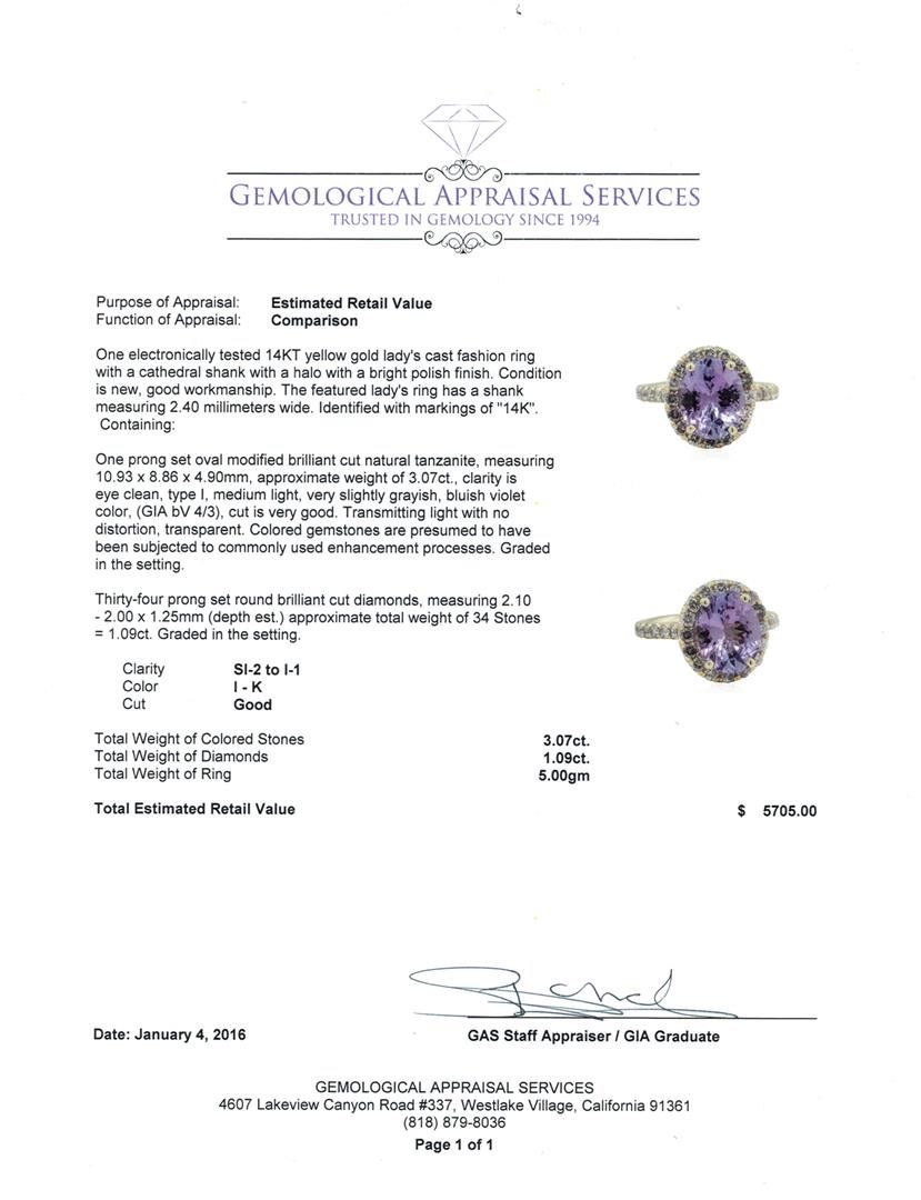 One electronically tested 14KT yellow gold lady's cast fashion ring with a cathedral shank with a halo with a bright polish finish. The featured lady's ring has a shank measuring 2.40 millimeters wide. Identified with markings of "14K". Condition is new, good workmanship. Containing: One prong set oval modified brilliant cut natural tanzanite, measuring 10.93 x 8.86 x 4.90mm, approximate weight of 3.07ct., clarity is eye clean, type I, medium light, very slightly grayish, bluish violet color, (GIA bV 4/3), cut is very good. Transmitting light with no distortion, transparent. Colored gemstones are presumed to have been subjected to commonly used enhancement processes. Graded in the setting. Thirty-Four prong set round brilliant cut diamonds, measuring 2.10 - 2.00 x 1.25mm (depth est.) approximate total weight of 34 Stones = 1.09ct. Graded in the setting. Clarity: SI-2 to I-1. Color: I - Good. Total Weight of Colored Stones 3.07ct. Total Weight of Diamonds 1.09ct. Total Weight of Ring 5.00gm. GAS Appraised at $5,705.00.