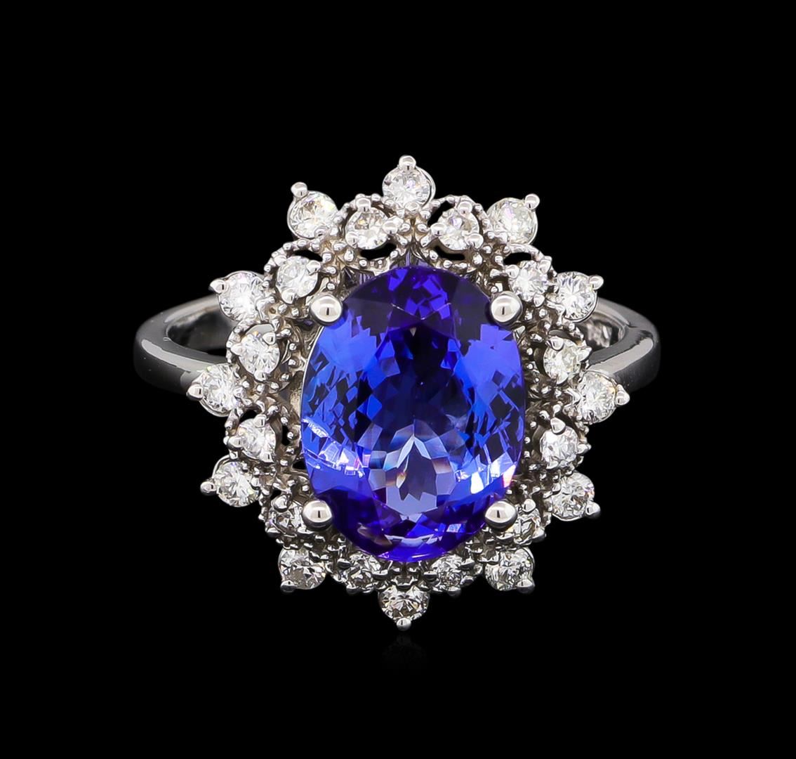 One electronically tested 14KT white gold lady's cast fashion ring with a basket double halo with a bright polish with milgrain detailing finish. The featured lady's ring has a shank measuring 2.40 millimeters wide. Identified with markings of "K14". Condition is new, good workmanship. Containing: One prong set oval modified brilliant cut natural tanzanite, measuring 11.13 x 8.37 x 4.66mm, approximate weight of 3.08ct., clarity is eye clean, type I, medium, moderately strong, violetish blue color, (GIA vB 5/4), cut is very good. Transmitting light with no distortion, transparent. Colored gemstones are presumed to have been subjected to commonly used enhancement processes. Graded in the setting. Twelve prong set round brilliant cut diamonds, measuring 1.90 - 1.80 x 1.13mm (depth est.) approximate total weight of 12 Stones = 0.28ct. Graded in the setting. Clarity: SI-1 to SI-2. Color: H - I. Cut Good Twelve prong set round brilliant cut diamonds, measuring 1.70 - 1.60 x 1.01mm (depth est.) approximate total weight of 12 Stones = 0.20ct. Graded in the setting. Clarity: VS-2 to SI-1. Color: H - I. Cut Good. Total Weight of Colored Stones 3.08ct. Total Weight of Diamonds 0.48ct. Total Weight of Ring 4.30gm. GAS Appraised at $6,735.00.