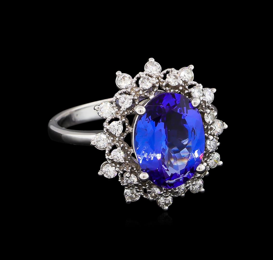 One electronically tested 14KT white gold lady's cast fashion ring with a basket double halo with a bright polish with milgrain detailing finish. The featured lady's ring has a shank measuring 2.40 millimeters wide. Identified with markings of "K14". Condition is new, good workmanship. Containing: One prong set oval modified brilliant cut natural tanzanite, measuring 11.13 x 8.37 x 4.66mm, approximate weight of 3.08ct., clarity is eye clean, type I, medium, moderately strong, violetish blue color, (GIA vB 5/4), cut is very good. Transmitting light with no distortion, transparent. Colored gemstones are presumed to have been subjected to commonly used enhancement processes. Graded in the setting. Twelve prong set round brilliant cut diamonds, measuring 1.90 - 1.80 x 1.13mm (depth est.) approximate total weight of 12 Stones = 0.28ct. Graded in the setting. Clarity: SI-1 to SI-2. Color: H - I. Cut Good Twelve prong set round brilliant cut diamonds, measuring 1.70 - 1.60 x 1.01mm (depth est.) approximate total weight of 12 Stones = 0.20ct. Graded in the setting. Clarity: VS-2 to SI-1. Color: H - I. Cut Good. Total Weight of Colored Stones 3.08ct. Total Weight of Diamonds 0.48ct. Total Weight of Ring 4.30gm. GAS Appraised at $6,735.00.