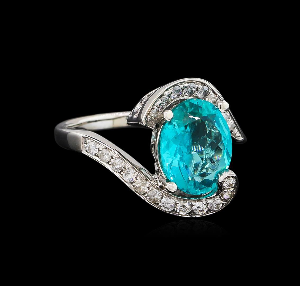 One electronically tested 14KT white gold lady's cast fashion ring with a bypass shank with a bright polish finish. The featured ladies ring has a shank measuring 2.00 millimeters in width. Trademark is Orianne. Identified with markings of "14K". Condition is new, good workmanship. Containing: One prong set oval modified brilliant cut natural apatite, measuring 10.80 x 8.45 x 4.60mm, 10%. bulge factor, approximate weight of 3.09ct., clarity is slightly included, medium, moderately strong, bluish green color, (GIA bG 5/4), cut is good. Transmitting light with a minimum of distortion, transparent. Colored gemstones are presumed to have been subjected to commonly used enhancement processes. Graded in the setting. Twenty-One prong set round brilliant cut diamonds, measuring 1.80 - 1.40 x 0.96mm (depth est.) approximate total weight of 21 Stones = 0.33ct. Graded in the setting. Clarity: SI-2 to I-1. Color: G - Good. Total Weight of Colored Stones 3.09ct. Total Weight of Diamonds 0.33ct. Total Weight of Ring 5.70gm. GAS Appraised at $3,625.00.