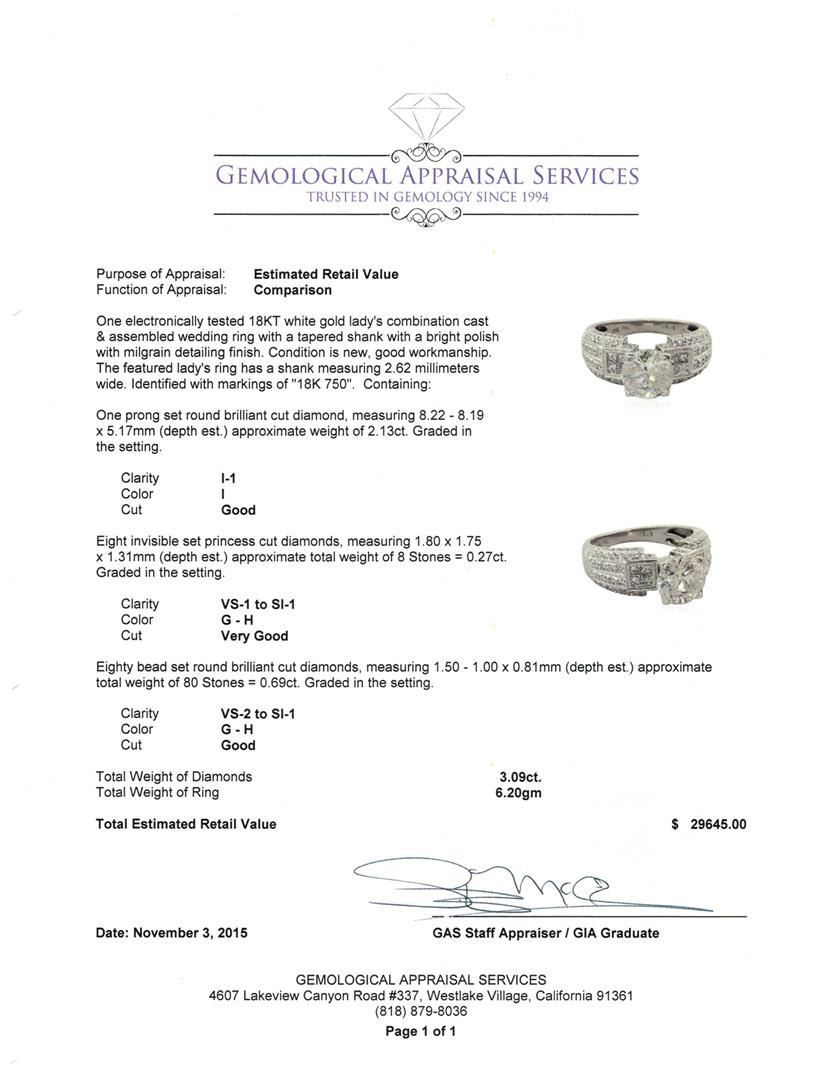 One electronically tested 18KT white gold lady's combination cast & assembled wedding ring with a tapered shank with a bright polish with milgrain detailing finish. The featured lady's ring has a shank measuring 2.62 millimeters wide. Identified with markings of "18K 750". Condition is new, good workmanship. Containing: One prong set round brilliant cut diamond, measuring 8.22 - 8.19 x 5.17mm (depth est.) approximate weight of 2.13ct. Graded in the setting. Clarity: I-1. Color: I. Cut Good Eight invisible set princess cut diamonds, measuring 1.80 x 1.75 x 1.31mm (depth est.) approximate total weight of 8 Stones = 0.27ct. Graded in the setting. Clarity: VS-1 to SI-1. Color: G - Very Good Eighty bead set round brilliant cut diamonds, measuring 1.50 - 1.00 x 0.81mm (depth est.) approximate total weight of 80 Stones = 0.69ct. Graded in the setting. Clarity: VS-2 to SI-1. Color: G - Good. Total Weight of Diamonds 3.09ct. Total Weight of Ring 6.20gm GAS Appraised at $29,645.00.