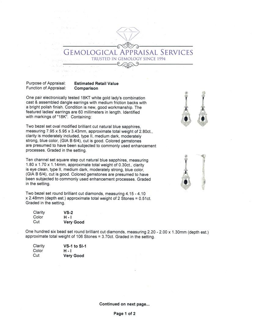 One pair electronically tested 18KT white gold lady's combination cast & assembled dangle earrings with medium friction backs with a bright polish finish. The featured ladies' earrings are 60 millimeters in length. Identified with markings of "18K". Condition is new, good workmanship. Containing: Two bezel set oval modified brilliant cut natural blue sapphires, measuring 7.95 x 5.95 x 3.43mm, approximate total weight of 2.80ct., clarity is moderately included, type II, medium dark, moderately strong, blue color, (GIA B 6/4), cut is good. Colored gemstones are presumed to have been subjected to commonly used enhancement processes. Graded in the setting. Ten channel set square step cut natural blue sapphires, measuring 1.80 x 1.70 x 1.14mm, approximate total weight of 0.30ct., clarity is eye clean, type II, medium dark, moderately strong, blue color, (GIA B 6/4), cut is good. Colored gemstones are presumed to have been subjected to commonly used enhancement processes. Graded in the setting. Two bezel set round brilliant cut diamonds, measuring 4.15 - 4.10 x 2.48mm (depth est.) approximate total weight of 2 Stones = 0.51ct. Graded in the setting. Clarity: VS-2. Color: H - I. Cut Very Good One Hundred Six bead set round brilliant cut diamonds, measuring 2.20 - 2.00 x 1.30mm (depth est.) approximate total weight of 106 Stones = 3.70ct. Graded in the setting. Clarity: VS-1 to SI-1. Color: H - I. Cut Very Good. Total Weight of Colored Stones 3.10ct. Total Weight of Diamonds 4.21ct. Total Weight of Earrings 13.50gm. GAS Appraised at $15,080.00.