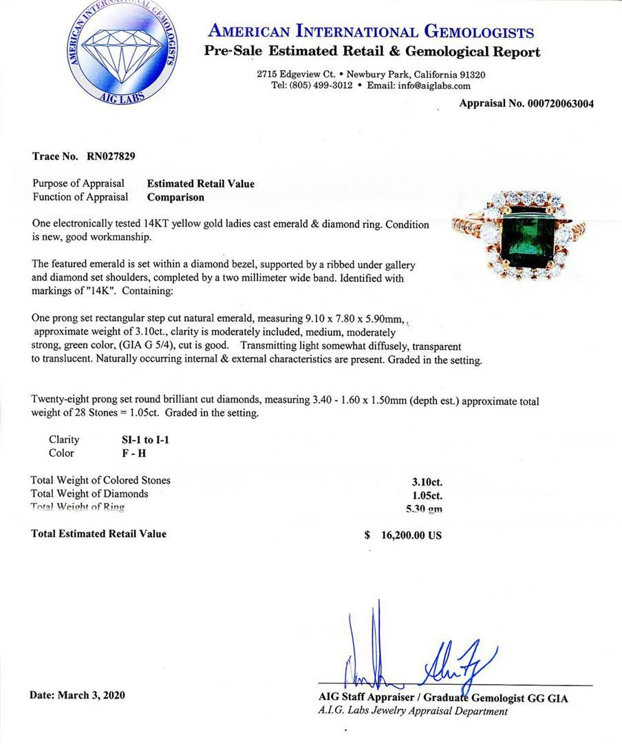 One electronically tested 14KT yellow gold ladies cast emerald & diamond ring. Condition is new, good workmanship. The featured emerald is set within a diamond bezel, supported by a ribbed under gallery and diamond set shoulders, completed by a two millimeter wide band. Identified with markings of "14K". Containing: One prong set rectangular step cut natural emerald, measuring 9.10 x 7.80 x 5.90mm, , approximate weight of 3.10ct., clarity is moderately included, medium, moderately strong, green color, (GIA G 5/4), cut is good. Transmitting light somewhat diffusely, transparent to translucent. Naturally occurring internal & external characteristics are present. Graded in the setting. Twenty-eight prong set round brilliant cut diamonds, measuring 3.40 - 1.60 x 1.50mm (depth est.) approximate total weight of 28 Stones = 1.05ctw. Graded in the setting. Clarity SI1 to I1 Color F - H Total Weight of Colored Stones 3.10ct. Total Weight of Diamonds 1.05ctw. Total Weight of Ring 5.30 gm