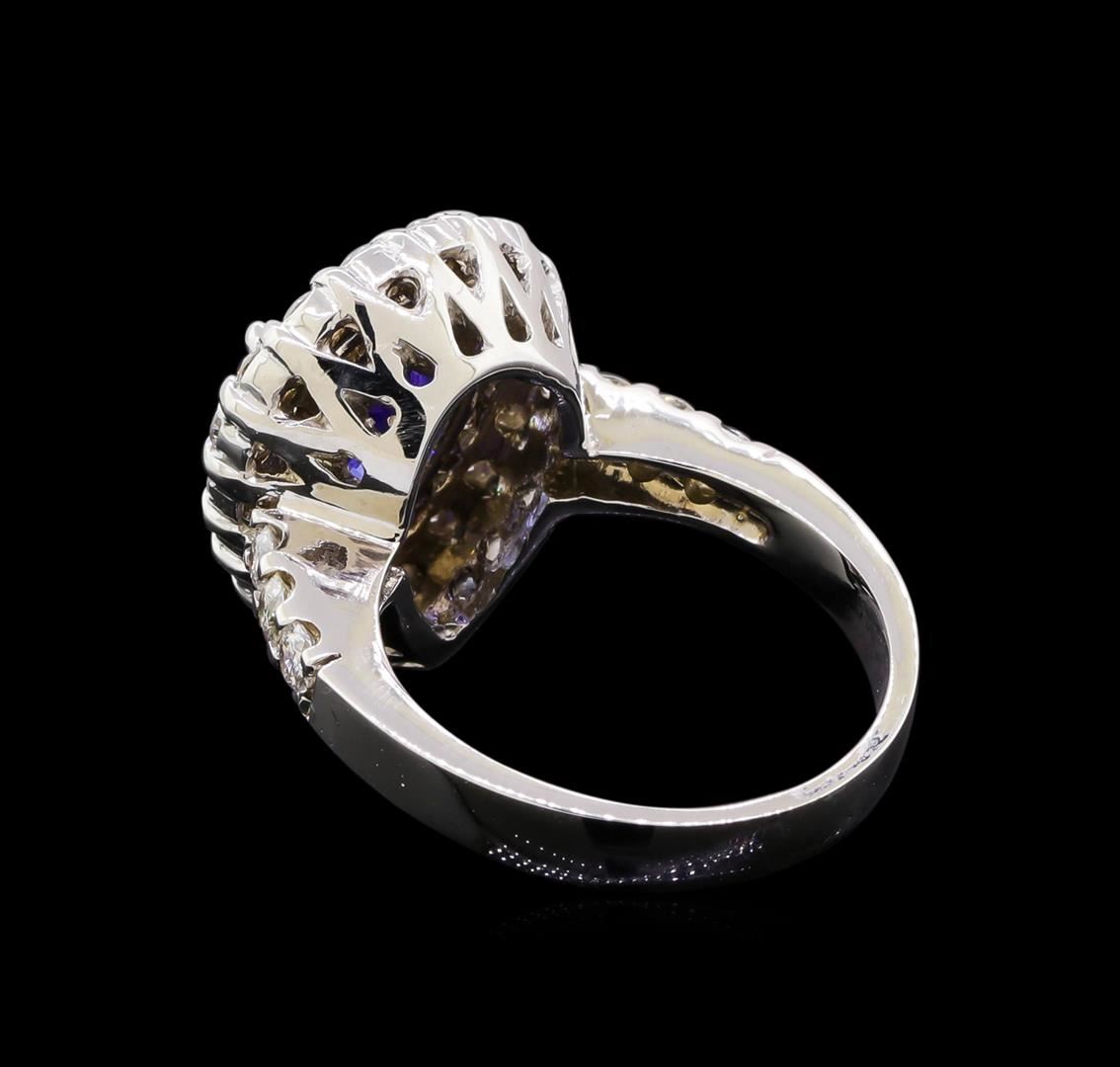 One electronically tested 14KT white gold lady's cast fashion ring with a basket halo with a bright polish finish. The featured lady's ring has a shank measuring 3.15 millimeters in width. Identified with markings of "K14". Condition is new, good workmanship. Containing: One prong set pear modified brilliant cut natural tanzanite, measuring 12.55 x 8.98 x 4.60mm, (depth est.) approximate weight of 3.10ct., clarity is eye clean, medium, moderately strong, bluish violet color, (GIA bV 5/4), cut is very good. Transmitting light with no distortion, transparent. Colored gemstones are presumed to have been subjected to commonly used enhancement processes. Graded in the setting. Six prong set round brilliant cut diamonds, measuring 2.50 - 2.40 x 1.47mm (depth est.) approximate total weight of 6 Stones = 0.30ct. Graded in the setting. Graded in the setting. Clarity: SI-1 to SI-2. Color: G - Good Nineteen prong set round brilliant cut diamonds, measuring 2.20 - 2.10 x 1.31mm (depth est.) approximate total weight of 19 Stones = 0.65ct. Graded in the setting. Clarity: SI-1 to SI-2. Color: H - I. Cut Good. Total Weight of Colored Stones 3.10ct. Total Weight of Diamonds 0.95ct. Total Weight of Ring 8.10gm. GAS Appraised at $8,185.00.