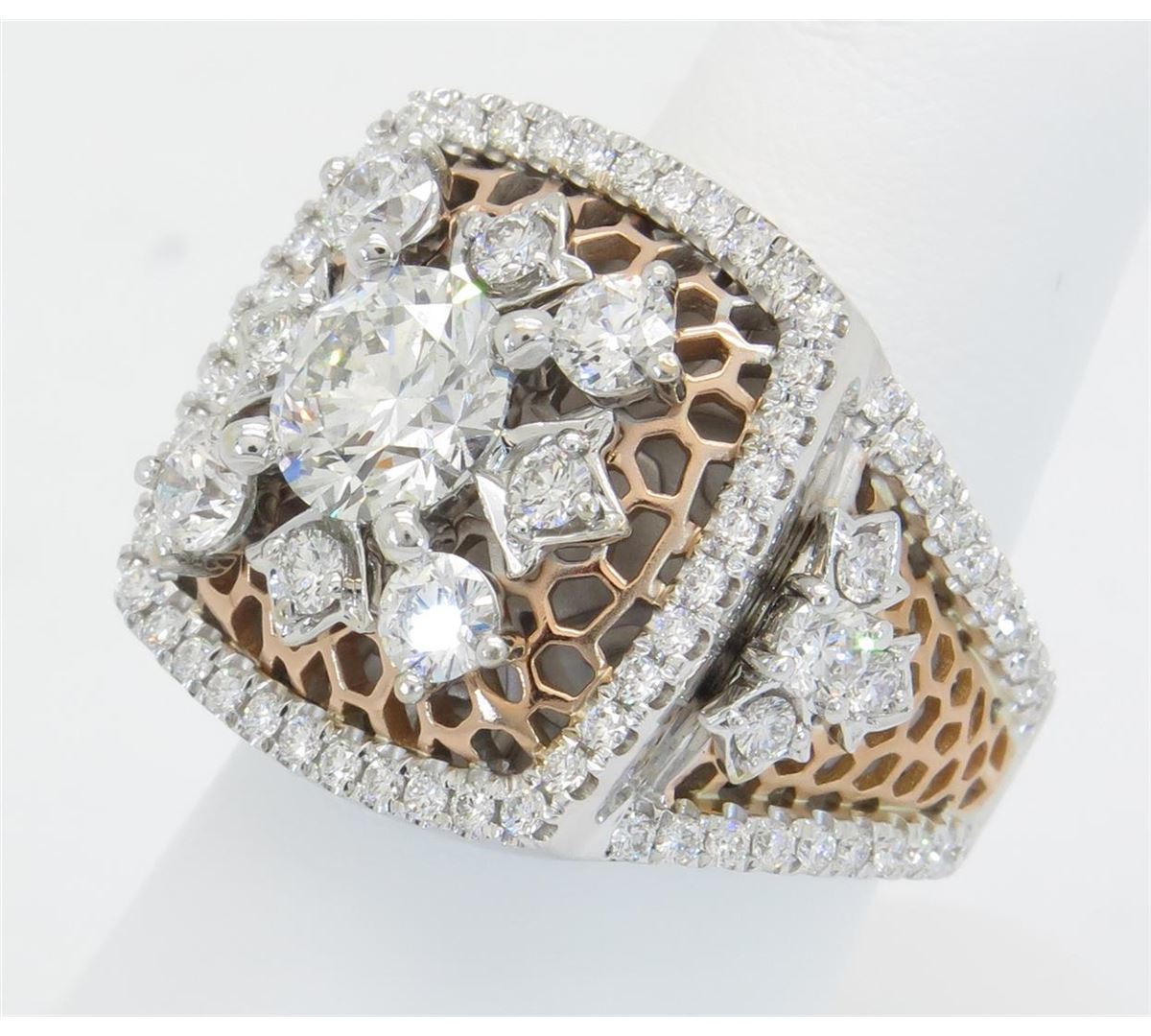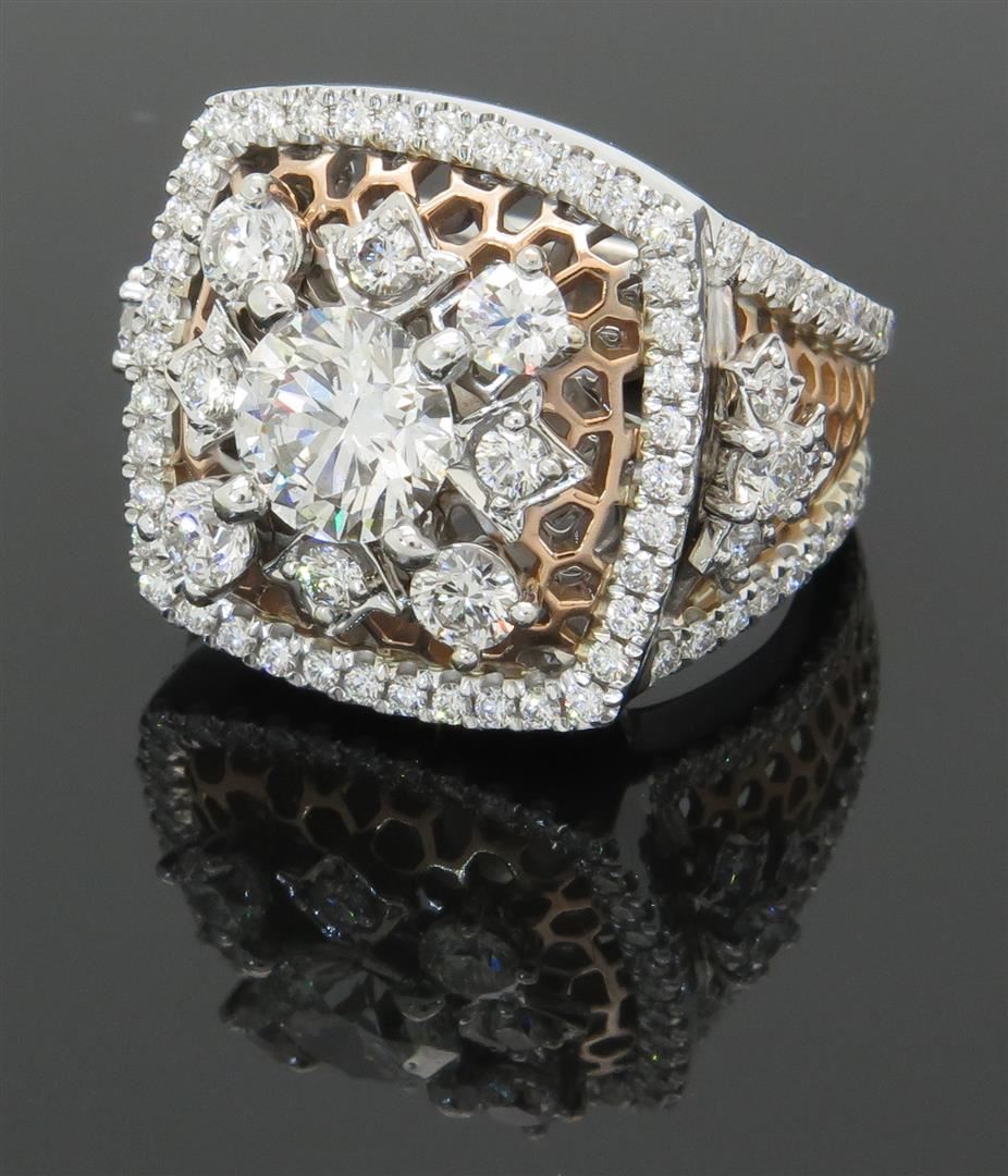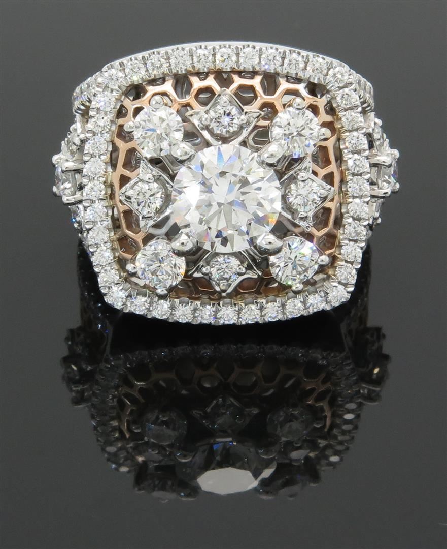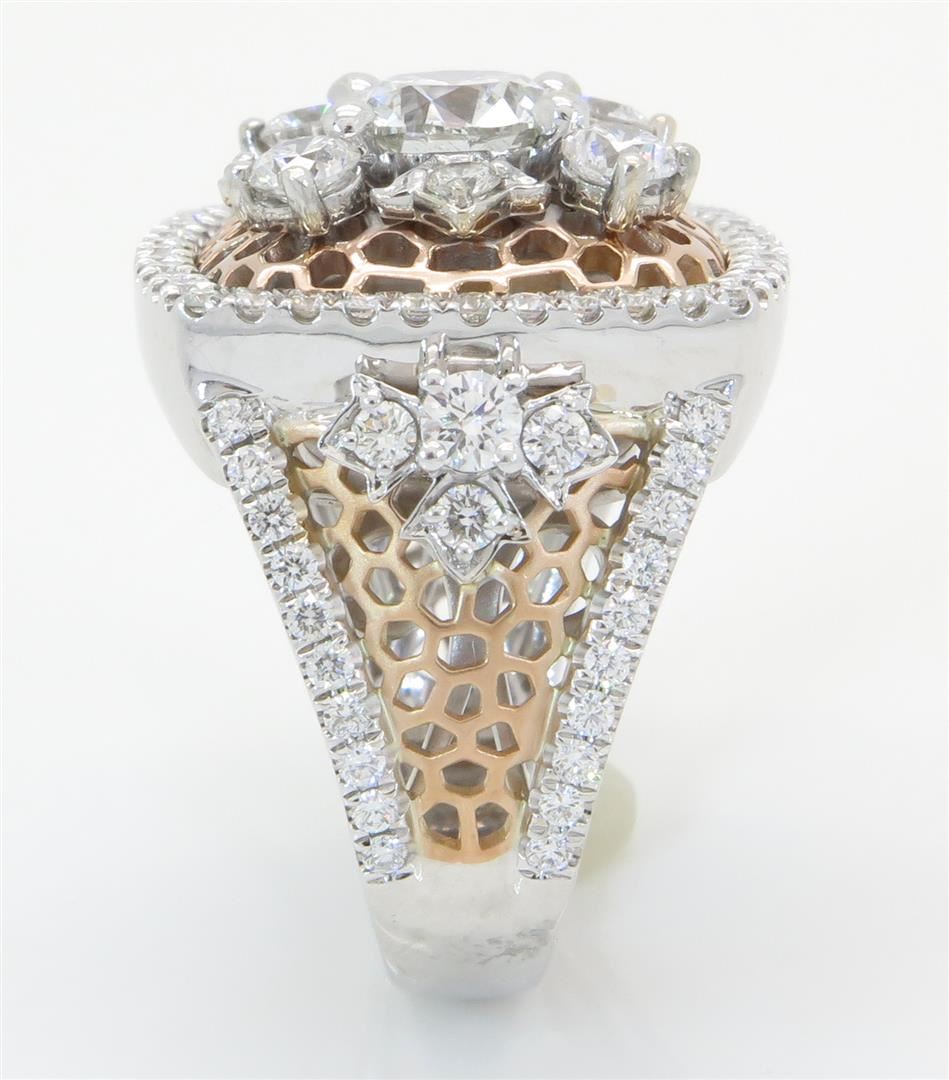 One tested 18K white and rose gold designer Gabriel & Co. diamond ring. Containing: One Round Brilliant Cut Diamond. Size: 1.30CT, Clarity: SI2, Color: H-I. 96 Round Brilliant Cut Diamonds. Approximate total diamond weight: 3.10CTW. Diamonds are graded in the mounting, unless otherwise stated. Weight: 15.8 grams, Size: 6.0. The inside of the ring is marked "18K Gabriel & Co. S204651".