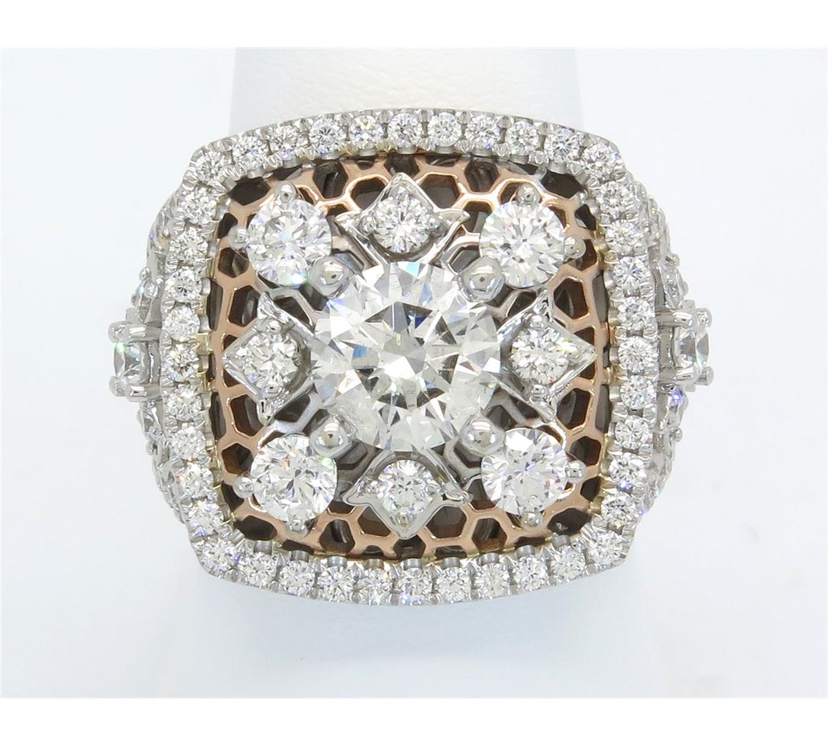 One tested 18K white and rose gold designer Gabriel & Co. diamond ring. Containing: One Round Brilliant Cut Diamond. Size: 1.30CT, Clarity: SI2, Color: H-I. 96 Round Brilliant Cut Diamonds. Approximate total diamond weight: 3.10CTW. Diamonds are graded in the mounting, unless otherwise stated. Weight: 15.8 grams, Size: 6.0. The inside of the ring is marked "18K Gabriel & Co. S204651".