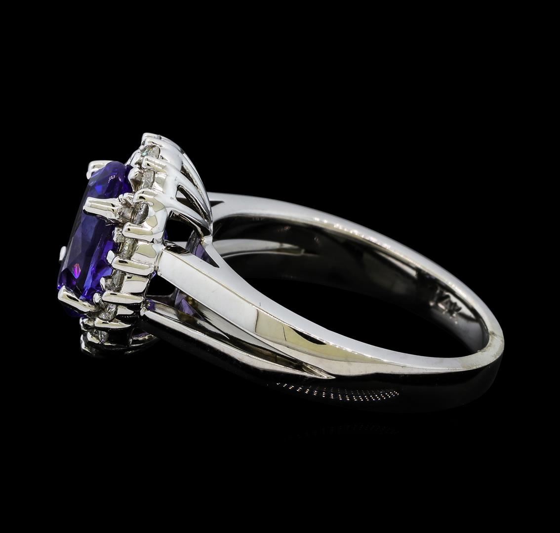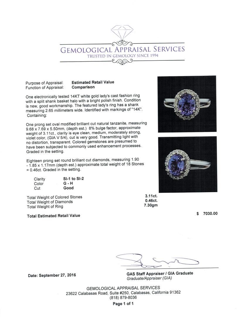 One electronically tested 14KT white gold lady's cast fashion ring with a split shank basket halo with a bright polish finish. The featured lady's ring has a shank measuring 2.65 millimeters wide. Identified with markings of '14K'. Condition is new, good workmanship. Containing: One prong set oval modified brilliant cut natural tanzanite, measuring 9.68 x 7.69 x 5.50mm, (depth est.) 8%. bulge factor, approximate weight of 3.11ct., clarity is eye clean, medium, moderately strong, violet color, (GIA V 5/4), cut is very good. Transmitting light with no distortion, transparent. Colored gemstones are presumed to have been subjected to commonly used enhancement processes. Graded in the setting. Eighteen prong set round brilliant cut diamonds, measuring 1.90 - 1.85 x 1.17mm (depth est.) approximate total weight of 18 Stones = 0.46ct. Graded in the setting. Clarity SI-1 to SI-2. Color: G - H Cut Good. Total Weight of Colored Stones 3.11ct.. Total Weight of Diamonds 0.46ct.. Total Weight of Ring 7.30gm. GAS Appraised at $7,030.00.