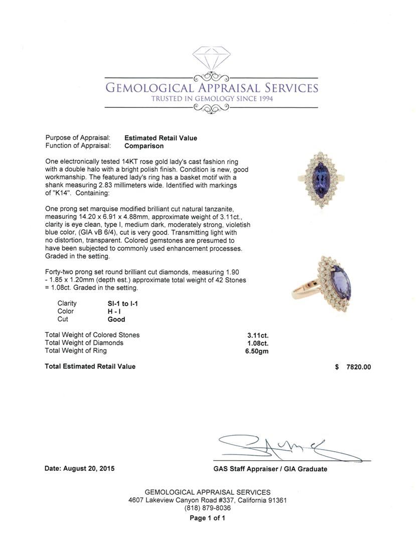 One electronically tested 14KT rose gold lady's cast fashion ring with a double halo with a bright polish finish. The featured lady's ring has a basket motif with a shank measuring 2.83 millimeters wide. Identified with markings of "K14". Condition is new, good workmanship. Containing: One prong set marquise modified brilliant cut natural tanzanite, measuring 14.20 x 6.91 x 4.88mm, approximate weight of 3.11ct., clarity is eye clean, type I, medium dark, moderately strong, violetish blue color, (GIA vB 6/4), cut is very good. Transmitting light with no distortion, transparent. Colored gemstones are presumed to have been subjected to commonly used enhancement processes. Graded in the setting. Forty-Two prong set round brilliant cut diamonds, measuring 1.90 - 1.85 x 1.20mm (depth est.) approximate total weight of 42 Stones = 1.08ct. Graded in the setting. Clarity: SI-1 to I-1. Color: H - I. Cut Good. Total Weight of Colored Stones 3.11ct. Total Weight of Diamonds 1.08ct. Total Weight of Ring 6.50gm. GAS Appraised at $7,820.00.