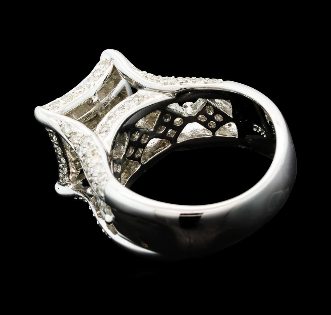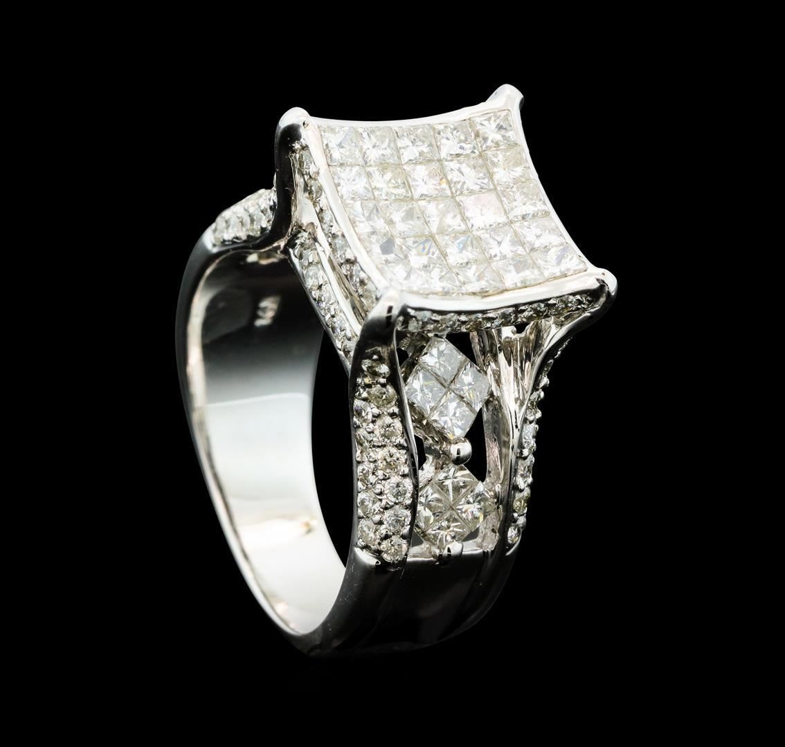One electronically tested 14KT white gold lady's combination cast & assembled fashion ring with a tapered cathedral shank with a bright polish finish. The featured lady's ring has a shank measuring 5.20 millimeters wide. Identified with markings of '14K'. Condition is new, good workmanship. Containing: Twenty-Five invisible set princess cut diamonds, measuring 2.20 x 2.00 x 1.50mm (depth est.) approximate total weight of 25 Stones = 1.37ct. Graded in the setting. Clarity SI-1 to SI-3. Color: H - I Cut Good Twenty invisible set princess cut diamonds, measuring 2.00 x 1.80 x 1.35mm (depth est.) approximate total weight of 20 Stones = 0.80 ct. Graded in the setting. Clarity SI-1 to SI-2. Color: H - I Cut Good Eighty-Two prong set round brilliant cut diamonds, measuring 1.50 - 1.40 x 0.90mm (depth est.) approximate total weight of 82 Stones = 0.95ct. Graded in the setting. Clarity SI-2 to I-1. Color: H - I Cut Good. Total Weight of Diamonds 3.12ct.. Total Weight of Ring 11.10gm. GAS Appraised.