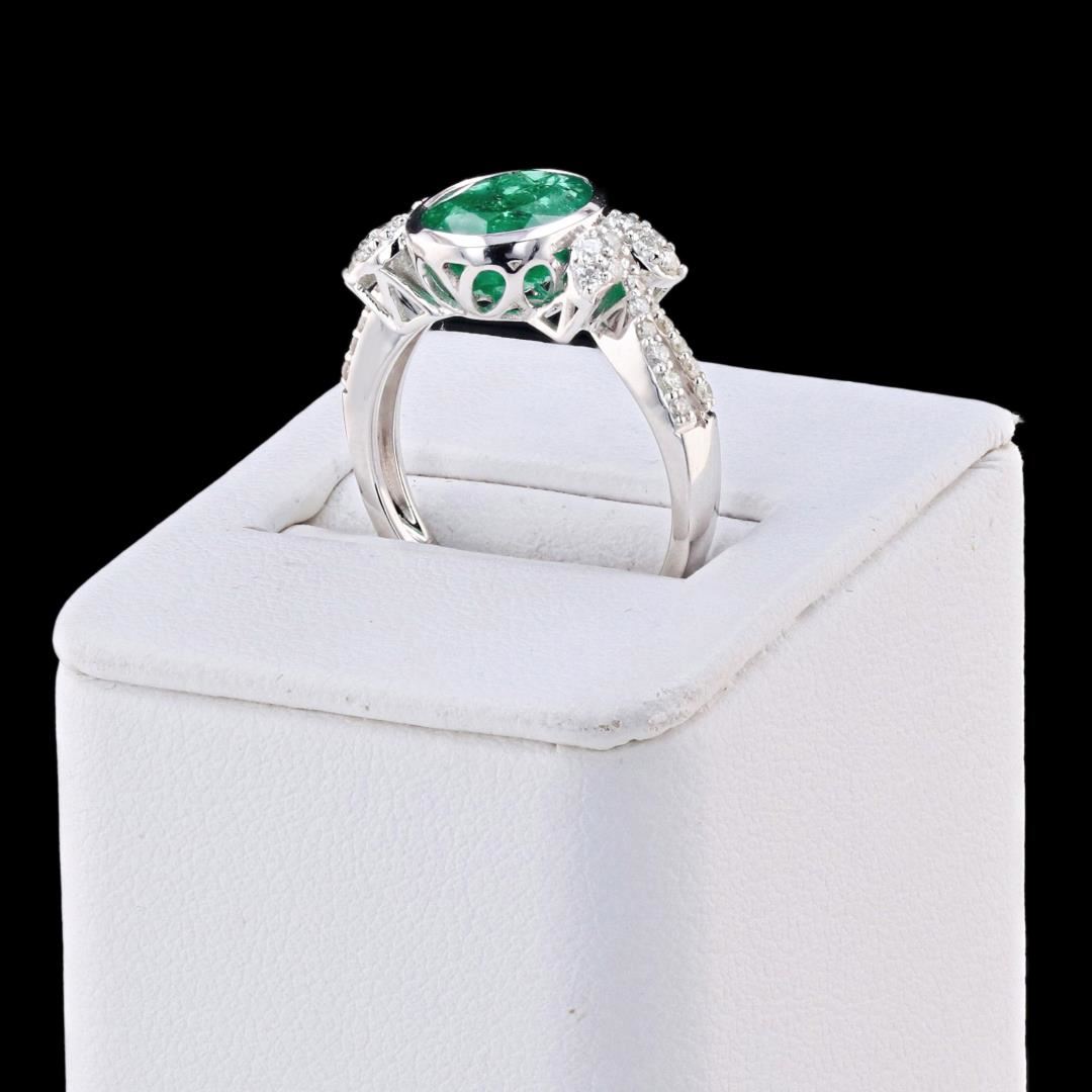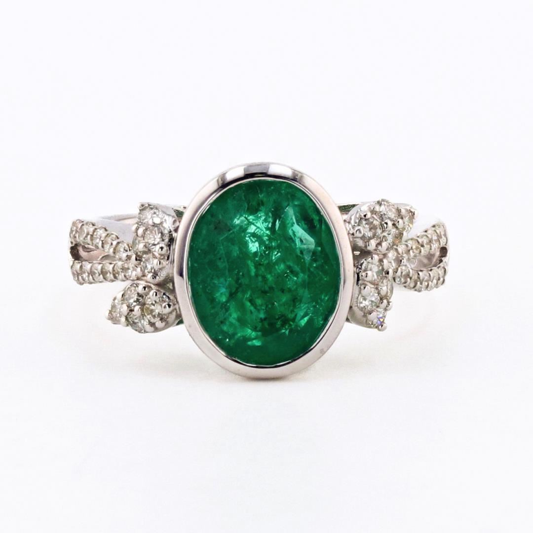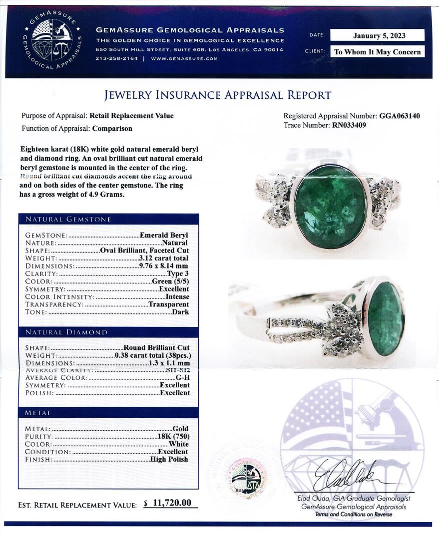 Eighteen karat (18K) white gold natural emerald beryl and diamond ring. An oval brilliant cut natural emerald beryl gemstone is mounted in the center of the ring. Round brilliant cut diamonds accent the ring around and on both sides of the center gemstone. The ring has a gross weight of 4.9 Grams. #NATURAL GEMSTONE# GEMSTONE: Emerald Beryl NATURE: Natural SHAPE: Oval Brilliant, Faceted Cut WEIGHT: 3.12 carat total DIMENSIONS: 9.76 x 8.14mm CLARITY: Type 3 COLOR: Green (5/5) SYMMETRY: Excellent COLOR INTENSITY: Intense TRANSPARENCY: Transparent TONE: Dark #NATURAL DIAMOND# SHAPE: Round Brilliant Cut WEIGHT: 0.38 carat total (38pcs.) DIMENSIONS: 1.3 x 1.1mm AVERAGE CLARITY: SI1-SI2 AVERAGE COLOR: G-H SYMMETRY: Excellent POLISH: Excellent #METAL# METAL: Gold PURITY: 18K (750) COLOR: White CONDITION: Excellent FINISH: High Polish Size: 6 1/2