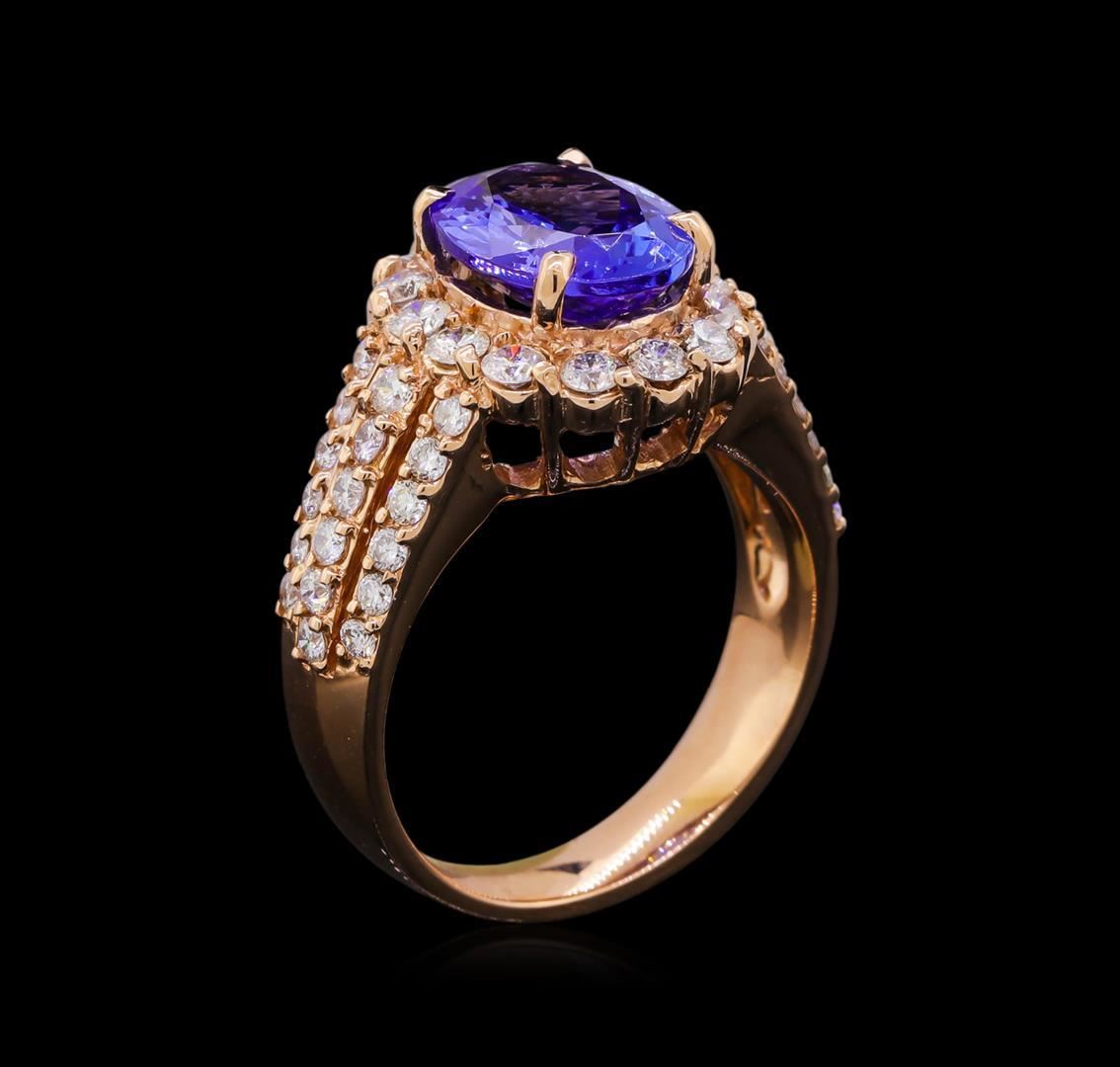 One electronically tested 14KT rose gold lady's cast fashion ring with a three row basket halo with a bright polish finish. The featured lady's ring has a shank measuring 3.70 millimeters in width. Identified with markings of "14K". Condition is new, good workmanship. Containing: One prong set oval modified brilliant cut natural tanzanite, measuring 10.85 x 8.35 x 4.70mm, (depth est.) approximate weight of 3.12ct., clarity is eye clean, medium dark, moderately strong, bluish violet color, (GIA bV 6/4), cut is very good. Transmitting light with no distortion, transparent. Colored gemstones are presumed to have been subjected to commonly used enhancement processes. Graded in the setting. Fourteen prong set round brilliant cut diamonds, measuring 2.40 - 2.30 x 1.41mm (depth est.) approximate total weight of 14 Stones = 0.62ct. Graded in the setting. Clarity: SI-1 to SI-2. Color: H - I. Cut Good Twelve prong set round brilliant cut diamonds, measuring 1.90 - 1.70 x 1.08mm (depth est.) approximate total weight of 12 Stones = 0.27ct. Graded in the setting. Clarity: SI-1 to SI-2. Color: H - I. Cut Good Twenty-Four prong set round brilliant cut diamonds, measuring 1.60 - 1.50 x 0.96mm (depth est.) approximate total weight of 24 Stones = 0.35ct. Graded in the setting. Clarity: SI-1 to SI-2. Color: H - I. Cut Good. Total Weight of Colored Stones 3.12ct. Total Weight of Diamonds 1.24ct. Total Weight of Ring 8.30gm. GAS Appraised.