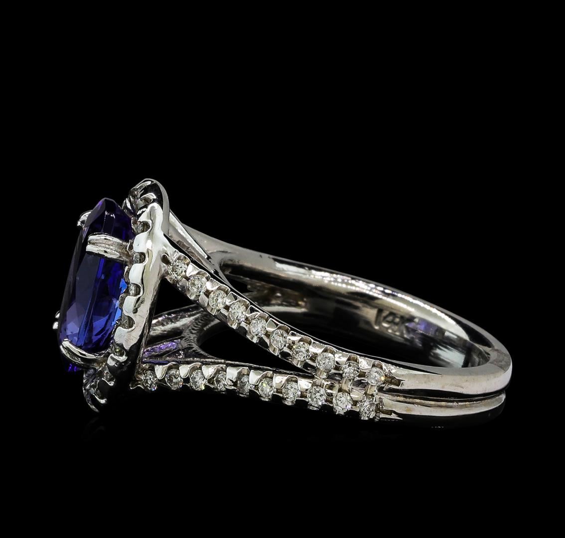 One electronically tested 14KT white gold lady's cast fashion ring with a split shank halo with a bright polish finish. The featured lady's ring has a double shank measuring 3.80 millimeters wide. Identified with markings of '14K'. Condition is new, good workmanship. Containing: One prong set oval modified brilliant cut natural tanzanite, measuring 11.04 x 7.69 x 5.33mm, (depth est.) approximate weight of 3.12ct., clarity is eye clean, medium dark, strong, violetish blue color, (GIA vB 6/5), cut is very good. Transmitting light with no distortion, transparent. Colored gemstones are presumed to have been subjected to commonly used enhancement processes. Graded in the setting. Sixty prong set round brilliant cut diamonds, measuring 1.40 - 1.30 x 0.84mm (depth est.) approximate total weight of 60 Stones = 0.56ct. Graded in the setting. Clarity SI-1 to I-1. Color: H - I Cut Good. Total Weight of Colored Stones 3.12ct.. Total Weight of Diamonds 0.56ct.. Total Weight of Ring 7.50gm. GAS Appraised at $8,295.00.