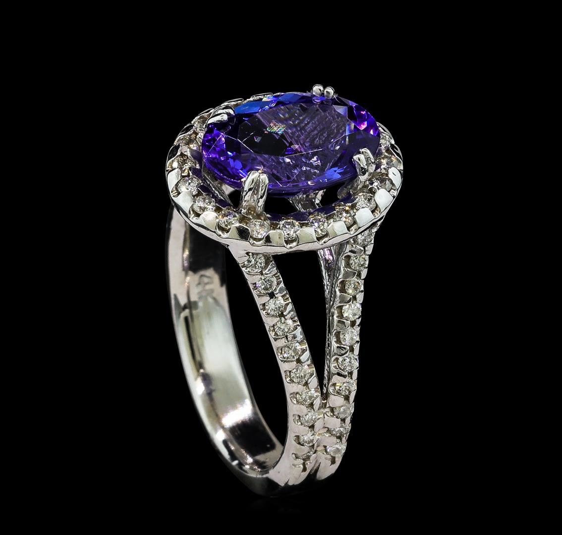 One electronically tested 14KT white gold lady's cast fashion ring with a split shank halo with a bright polish finish. The featured lady's ring has a double shank measuring 3.80 millimeters wide. Identified with markings of '14K'. Condition is new, good workmanship. Containing: One prong set oval modified brilliant cut natural tanzanite, measuring 11.04 x 7.69 x 5.33mm, (depth est.) approximate weight of 3.12ct., clarity is eye clean, medium dark, strong, violetish blue color, (GIA vB 6/5), cut is very good. Transmitting light with no distortion, transparent. Colored gemstones are presumed to have been subjected to commonly used enhancement processes. Graded in the setting. Sixty prong set round brilliant cut diamonds, measuring 1.40 - 1.30 x 0.84mm (depth est.) approximate total weight of 60 Stones = 0.56ct. Graded in the setting. Clarity SI-1 to I-1. Color: H - I Cut Good. Total Weight of Colored Stones 3.12ct.. Total Weight of Diamonds 0.56ct.. Total Weight of Ring 7.50gm. GAS Appraised at $8,295.00.