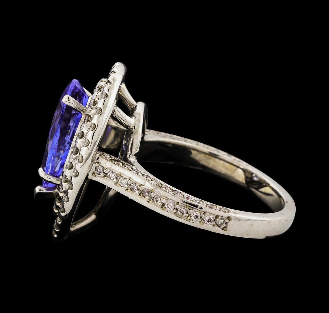 One electronically tested 14KT white gold lady's cast fashion ring with a double halo with a bright polish finish. The featured lady's ring has a shank measuring 2.46 millimeters wide. Identified with markings of '14K'. Condition is new, good workmanship. Containing: One prong set pear modified brilliant cut natural tanzanite, measuring 12.70 x 8.00 x 5.00mm, (depth est.) approximate weight of 3.12ct., clarity is eye clean, medium light, very slightly grayish, bluish violet color, (GIA bV 4/3), cut is good. Transmitting light with no distortion, transparent. Colored gemstones are presumed to have been subjected to commonly used enhancement processes. Graded in the setting. Fifty-Two prong set round brilliant cut diamonds, measuring 1.40 - 1.35 x 0.86mm (depth est.) approximate total weight of 52 Stones = 0.51ct. Graded in the setting. Clarity SI-1 to SI-2. Color: G - I Cut Good Seventy prong set round brilliant cut diamonds, measuring 1.15 - 1.05 x 0.68mm (depth est.) approximate total weight of 70 Stones = 0.35ct. Graded in the setting. Clarity SI-1 to SI-2. Color: G - I Cut Good. Total Weight of Colored Stones 3.12ct.. Total Weight of Diamonds 0.86ct.. Total Weight of Ring 7.80gm. GAS Appraised.