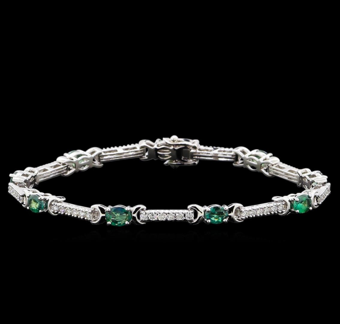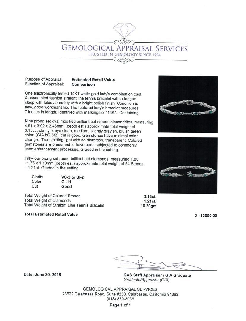 One electronically tested 14KT white gold lady's combination cast & assembled fashion straight line tennis bracelet with a tongue clasp with foldover safety with a bright polish finish. The featured lady's bracelet measures 7 inches in length. Identified with markings of "14K". Condition is new, good workmanship. Containing: Nine prong set oval modified brilliant cut natural alexandrites, measuring 4.91 x 3.92 x 2.43mm, (depth est.) approximate total weight of 3.13ct., clarity is eye clean, medium, slightly grayish, bluish green color, (GIA bG 5/2), cut is good. Gemstones have minimal color change. Transmitting light with no distortion, transparent. Colored gemstones are presumed to have been subjected to commonly used enhancement processes. Graded in the setting. Fifty-Four prong set round brilliant cut diamonds, measuring 1.80 - 1.75 x 1.10mm (depth est.) approximate total weight of 54 Stones = 1.21ct. Graded in the setting. Clarity: VS-2 to SI-2. Color: G - Good. Total Weight of Colored Stones 3.13ct. Total Weight of Diamonds 1.21ct. Total Weight of Straight Line Tennis Bracelet 10.20gm. GAS Appraised at $13,050.00.