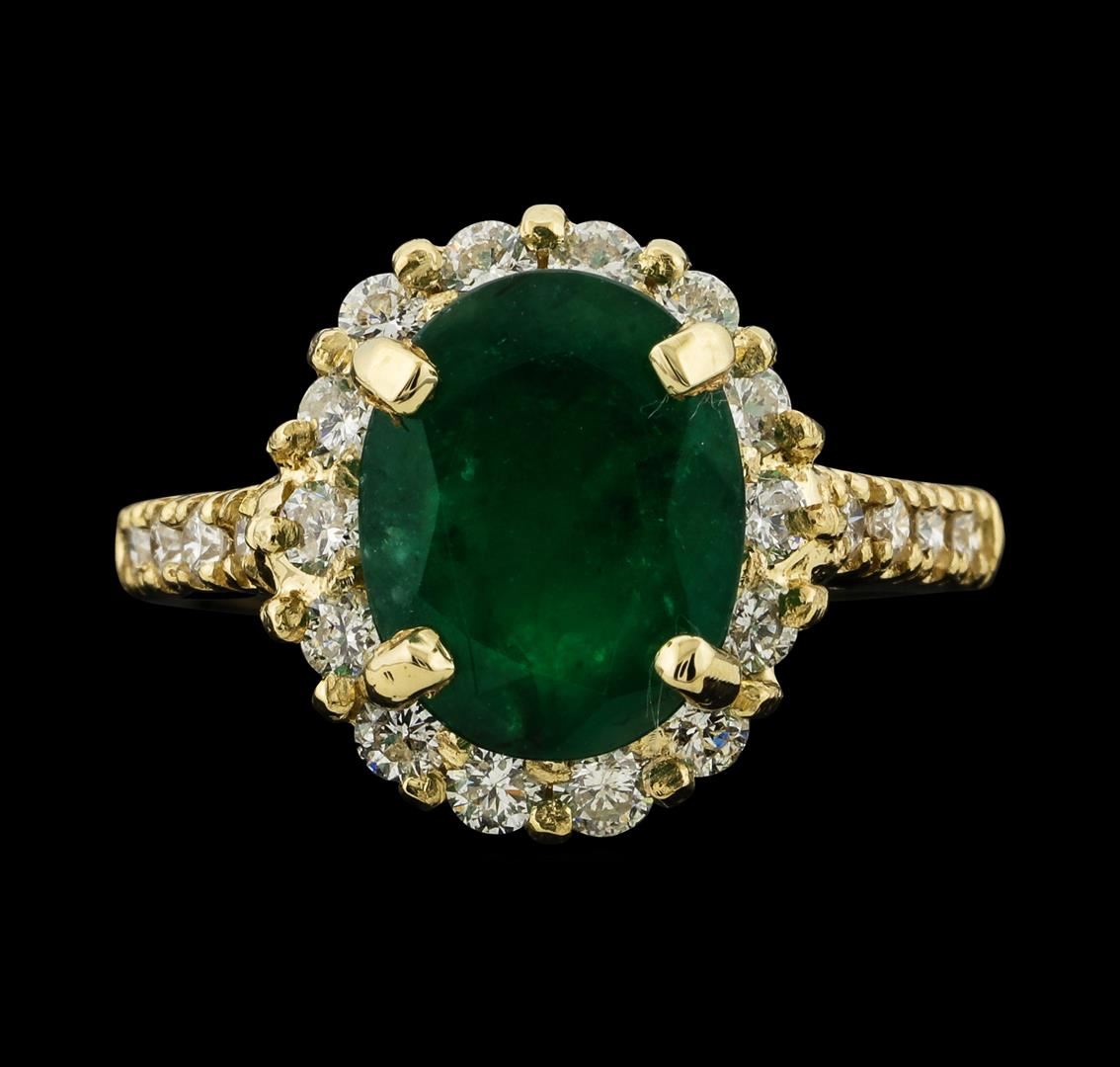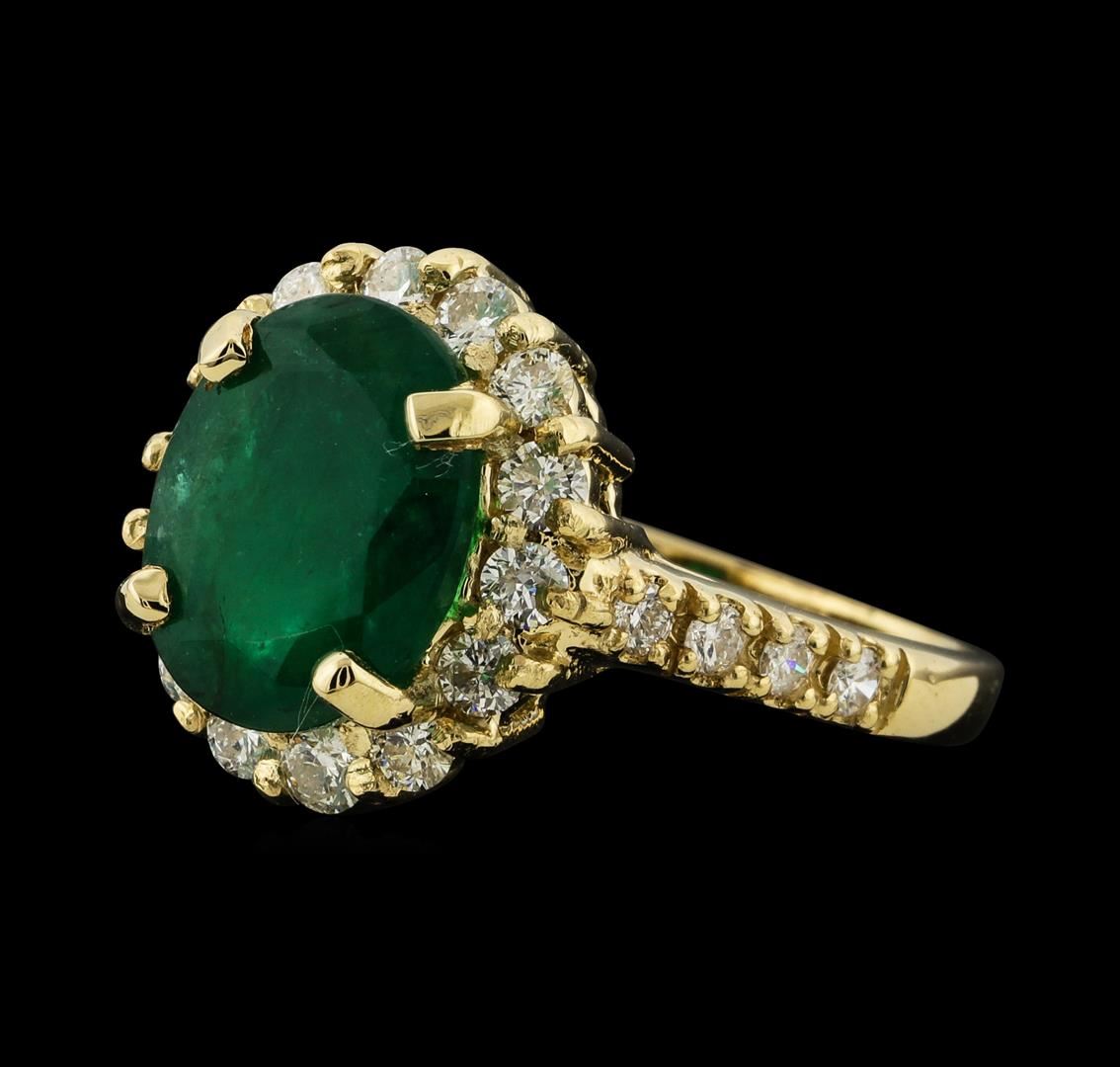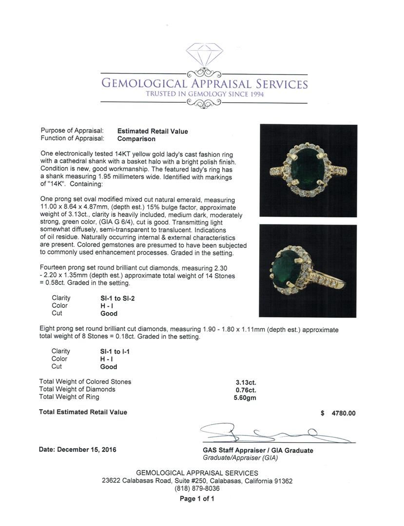 One electronically tested 14KT yellow gold lady's cast fashion ring with a cathedral shank with a basket halo with a bright polish finish. The featured lady's ring has a shank measuring 1.95 millimeters wide. Identified with markings of '14K'. Condition is new, good workmanship. Containing: One prong set oval modified mixed cut natural emerald, measuring 11.00 x 8.64 x 4.87mm, (depth est.) 15%. bulge factor, approximate weight of 3.13ct., clarity is heavily included, medium dark, moderately strong, green color, (GIA G 6/4), cut is good. Transmitting light somewhat diffusely, semi-transparent to translucent. Indications of oil residue. Naturally occurring internal & external characteristics are present. Colored gemstones are presumed to have been subjected to commonly used enhancement processes. Graded in the setting. Fourteen prong set round brilliant cut diamonds, measuring 2.30 - 2.20 x 1.35mm (depth est.) approximate total weight of 14 Stones = 0.58ct. Graded in the setting. Clarity SI-1 to SI-2. Color: H - I Cut Good Eight prong set round brilliant cut diamonds, measuring 1.90 - 1.80 x 1.11mm (depth est.) approximate total weight of 8 Stones = 0.18ct. Graded in the setting. Clarity SI-1 to I-1. Color: H - I Cut Good. Total Weight of Colored Stones 3.13ct.. Total Weight of Diamonds 0.76ct.. Total Weight of Ring 5.60gm. GAS Appraised at $4,780.00.