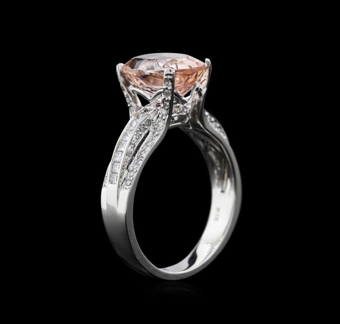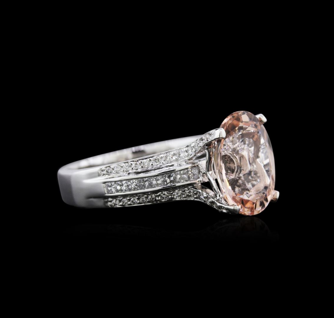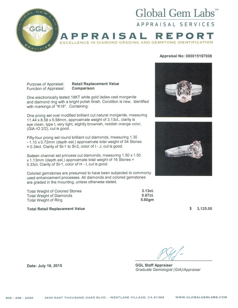 One electronically tested 18KT white gold ladies cast morganite and diamond ring with a bright polish finish. Identified with markings of "K18". Condition is new. Containing: One prong set oval modified brilliant cut natural morganite, measuring 11.44 x 8.58 x 5.58mm, approximate weight of 3.13ct., clarity is eye clean, type I, very light, slightly brownish, reddish orange color, (GIA rO 2/2), cut is good. Fifty-Four prong set round brilliant cut diamonds, measuring 1.30 - 1.10 x 0.72mm (depth est.) approximate total weight of 54 Stones = 0.34ct. Clarity: SI-1 to SI-2. Color: I - J, Cut is Good. Sixteen channel set princess cut diamonds, measuring 1.50 x 1.50 x 1.13mm (depth est.) approximate total weight of 16 Stones = 0.33ct. Clarity: SI-1. Color: H - I, Cut is Good. Colored gemstones are presumed to have been subjected to commonly used enhancement processes. All diamonds and colored gemstones are graded in the mounting, unless otherwise stated. Total Weight of Colored Stones 3.13ct. Total Weight of Diamonds 0.67ct. Total Weight of Ring 5.60 grams. GGL Appraised at $3,125.00.