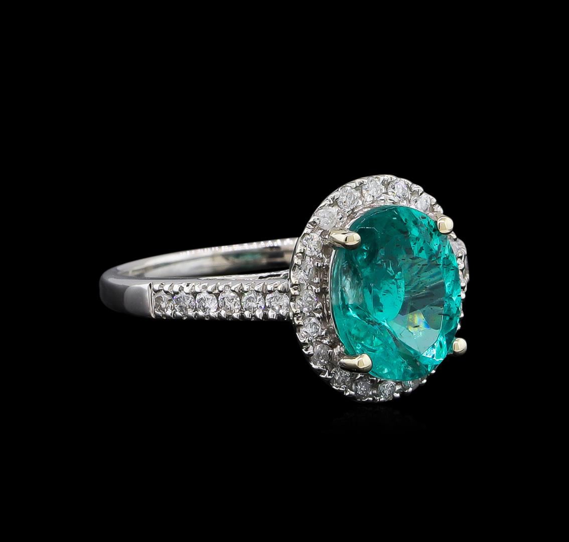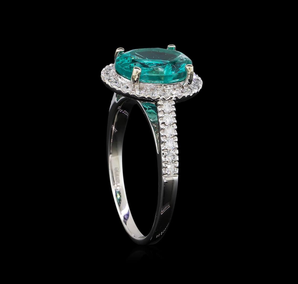 One electronically tested 14KT white gold lady's cast cathedral halo ring with a bright polish finish. The featured ladies ring has a shank measuring 1.71 millimeters in width. Trademark is Orianne. Identified with markings of "14K". Condition is new, good workmanship. Containing: One prong set oval modified brilliant cut natural apatite, measuring 10.00 x 7.96 x 5.75mm, 3%. bulge factor, approximate weight of 3.14ct., clarity is moderately included, medium, moderately strong, bluish green color, (GIA bG 5/4), cut is good. Transmitting light somewhat diffusely, semi-transparent to translucent. Colored gemstones are presumed to have been subjected to commonly used enhancement processes. Graded in the setting. Twelve prong set round brilliant cut diamonds, measuring 1.45 - 1.40 x 0.90mm (depth est.) approximate total weight of 12 Stones = 0.14ct. Graded in the setting. Clarity: SI-2 to I-1. Color: H - I. Cut Very Good Twenty prong set round brilliant cut diamonds, measuring 1.40 - 1.30 x 0.81mm (depth est.) approximate total weight of 20 Stones = 0.19ct. Graded in the setting. Clarity: SI-2 to I-1. Color: H - I. Cut Good. Total Weight of Colored Stones 3.14ct. Total Weight of Diamonds 0.33ct. Total Weight of Ring 3.50gm. GAS Appraised at $3,275.00.
