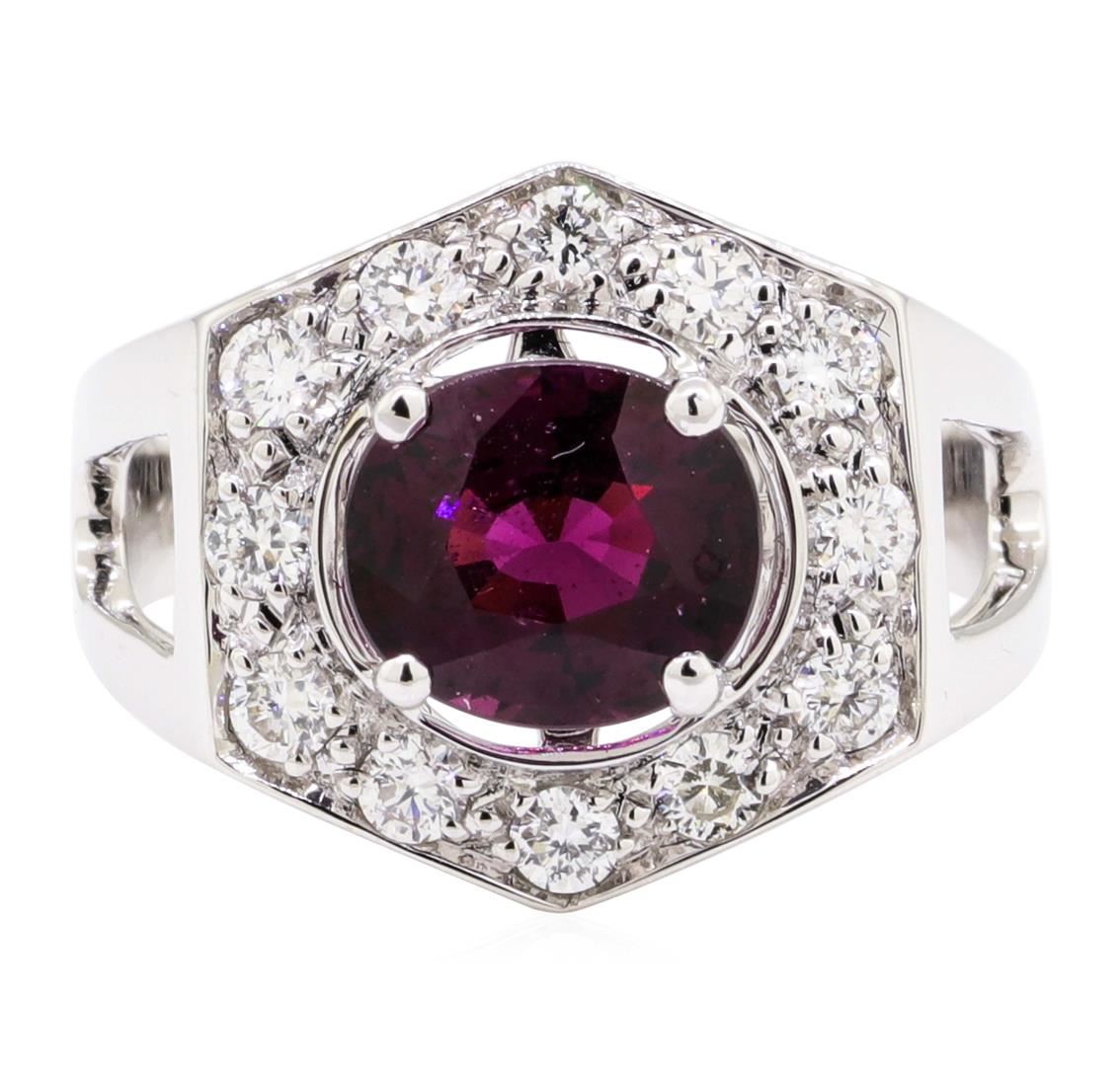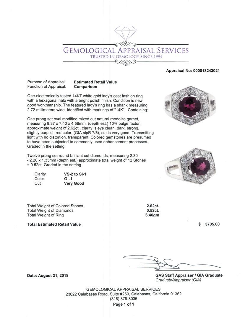 One electronically tested 14KT white gold lady's cast fashion ring with a hexagonal halo with a bright polish finish. The featured lady's ring has a shank measuring 2.72 millimeters wide. Identified with markings of '14K'. Condition is new, good workmanship. Containing: One prong set oval modified mixed cut natural rhodolite garnet, measuring 8.37 x 7.40 x 4.58mm, (depth est.) 10%. bulge factor, approximate weight of 2.62ct., clarity is eye clean, dark, strong, slightly purplish red color, (GIA slpR 7/5), cut is very good. Transmitting light with no distortion, transparent. Colored gemstones are presumed to have been subjected to commonly used enhancement processes. Graded in the setting. Twelve prong set round brilliant cut diamonds, measuring 2.30 - 2.20 x 1.35mm (depth est.) approximate total weight of 12 Stones = 0.52ct. Graded in the setting. Color G - I Clarity VS-2 to SI-1 Cut Very Good. Total Weight of Colored Stones 2.62ct.. Total Weight of Diamonds 0.52ct.. Total Weight of Ring 6.40gm GAS Appraised at $3705.00. GAS Appraised.