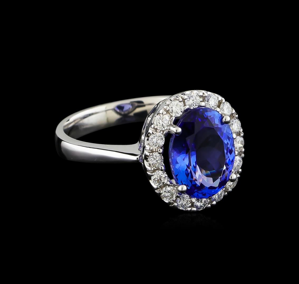 One electronically tested 14KT white gold lady's cast fashion ring with a basket halo with a bright polish finish. The featured lady's ring has a shank measuring 2.89 millimeters wide. Identified with markings of "K14". Condition is new, good workmanship. Containing: One prong set oval modified brilliant cut natural tanzanite, measuring 10.64 x 8.14 x 5.04mm, 3%. bulge factor, approximate weight of 3.14ct., clarity is eye clean, type I, medium dark, moderately strong, violetish blue color, (GIA vB 6/4), cut is very good. Transmitting light with no distortion, transparent. Colored gemstones are presumed to have been subjected to commonly used enhancement processes. Graded in the setting. Sixteen prong set round brilliant cut diamonds, measuring 1.90 - 1.80 x 1.15mm (depth est.) approximate total weight of 16 Stones = 0.40ct. Graded in the setting. Clarity: SI-1 to SI-2. Color: G - Good. Total Weight of Colored Stones 3.14ct. Total Weight of Diamonds 0.40ct. Total Weight of Ring 4.90gm GAS Appraised at $7,235.00.