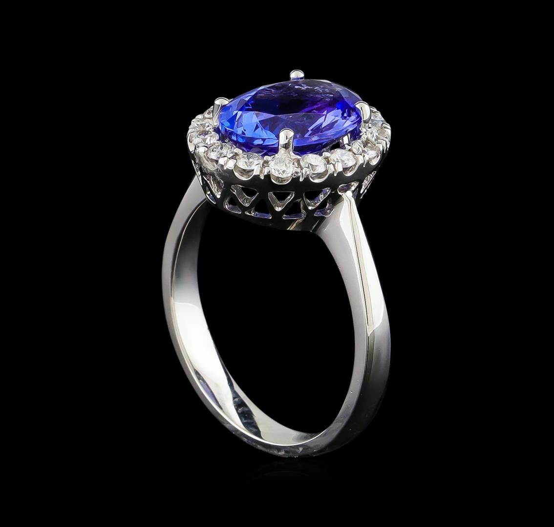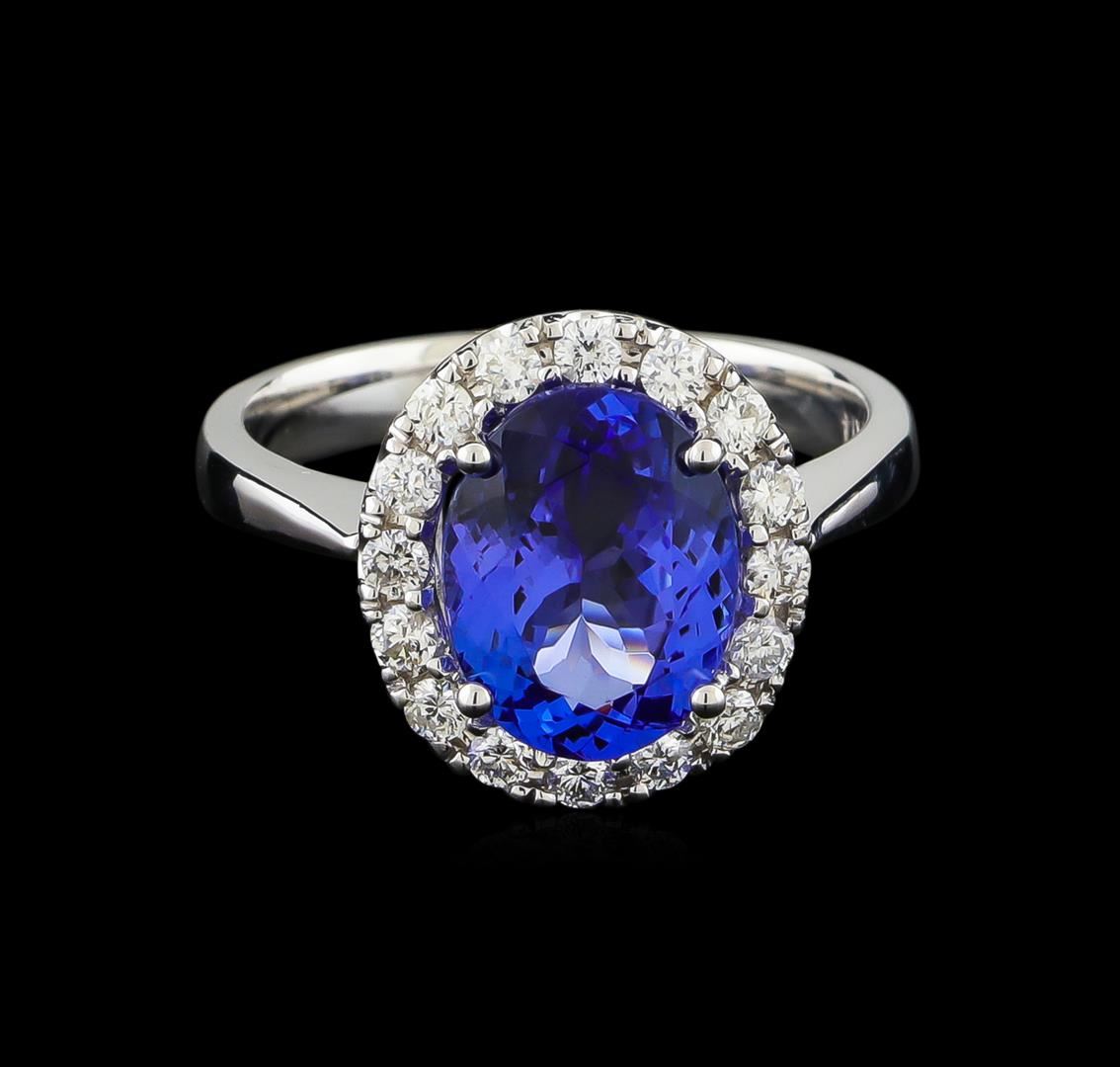 One electronically tested 14KT white gold lady's cast fashion ring with a basket halo with a bright polish finish. The featured lady's ring has a shank measuring 2.89 millimeters wide. Identified with markings of "K14". Condition is new, good workmanship. Containing: One prong set oval modified brilliant cut natural tanzanite, measuring 10.64 x 8.14 x 5.04mm, 3%. bulge factor, approximate weight of 3.14ct., clarity is eye clean, type I, medium dark, moderately strong, violetish blue color, (GIA vB 6/4), cut is very good. Transmitting light with no distortion, transparent. Colored gemstones are presumed to have been subjected to commonly used enhancement processes. Graded in the setting. Sixteen prong set round brilliant cut diamonds, measuring 1.90 - 1.80 x 1.15mm (depth est.) approximate total weight of 16 Stones = 0.40ct. Graded in the setting. Clarity: SI-1 to SI-2. Color: G - Good. Total Weight of Colored Stones 3.14ct. Total Weight of Diamonds 0.40ct. Total Weight of Ring 4.90gm GAS Appraised at $7,235.00.