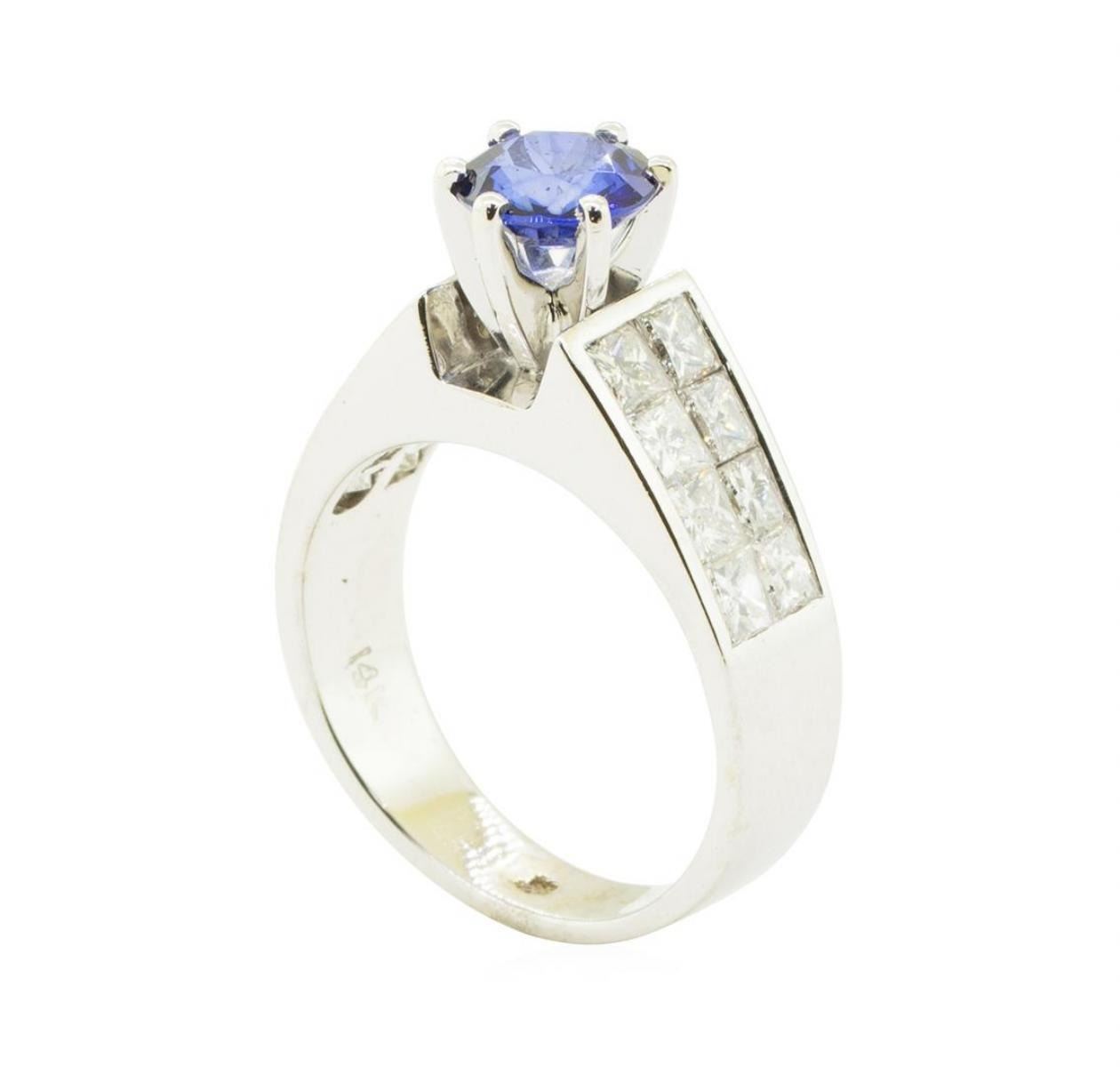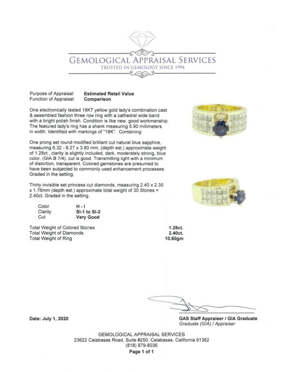 One electronically tested 14KT white gold lady's combination cast & assembled fashion double row ring with a wide band cathedral motif with a bright polish finish. The featured lady's ring has a shank measuring 4.20 millimeters in width. Identified with markings of '14K'. Condition is like new, good workmanship. Containing: One prong set round modified brilliant cut natural blue sapphire, measuring 6.80 - 6.76 x 3.40 mm, (depth est.) approximate weight of 1.30 ct., clarity is eye clean, medium dark, strong, blue color, (GIA B 6/5), cut is very good. Transmitting light with a minimum of distortion, transparent. Colored gemstones are presumed to have been subjected to commonly used enhancement processes. Graded in the setting. Sixteen invisible set princess cut diamonds, measuring 3.00 x 2.50 x 1.88mm (depth est.) approximate total weight of 16 Stones = 1.85ct. Graded in the setting. Color H - I Clarity VS-1 to VS-2 Cut Very Good. Total Weight of Colored Stones 1.30 ct.. Total Weight of Diamonds 1.85ct.. Total Weight of Ring 7.30gm GAS Appraised at $5720.00. GAS Appraised.