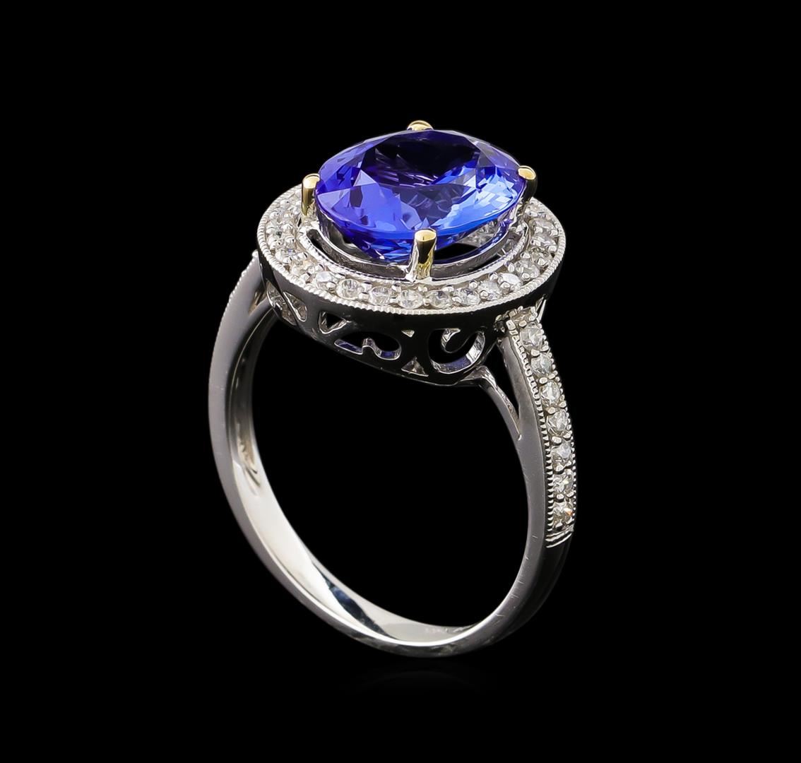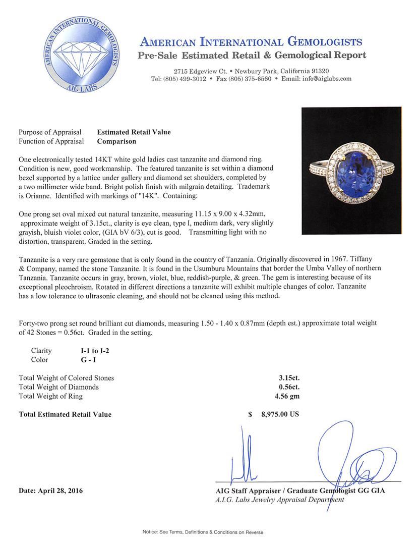 One electronically tested 14KT white gold ladies cast tanzanite and diamond ring. The featured tanzanite is set within a diamond bezel supported by a lattice under gallery and diamond set shoulders, completed by a two millimeter wide band. Bright polish finish with milgrain detailing. Trademark is Orianne. Identified with markings of "14K". Condition is new, good workmanship. Containing: One prong set oval mixed cut natural tanzanite, measuring 11.15 x 9.00 x 4.32mm, approximate weight of 3.15ct., clarity is eye clean, type I, medium dark, very slightly grayish, bluish violet color, (GIA bV 6/3), cut is good. Transmitting light with no distortion, transparent. Graded in the setting. Tanzanite is a very rare gemstone that is only found in the country of Tanzania. Originally discovered in 1967. Tiffany & Company, named the stone Tanzanite. It is found in the Usumburu Mountains that border the Umba Valley of northern Tanzania. Tanzanite occurs in gray, brown, violet, blue, reddish-purple, & green. The gem is interesting because of its exceptional pleochroism. Rotated in different directions a tanzanite will exhibit multiple changes of color. Tanzanite has a low tolerance to ultrasonic cleaning, and should not be cleaned using this method. Forty-Two prong set round brilliant cut diamonds, measuring 1.50 - 1.40 x 0.87mm (depth est.) approximate total weight of 42 Stones = 0.56ct. Graded in the setting. Clarity: I-1 to I-2. Color: G - I. Total Weight of Colored Stones 3.15ct. Total Weight of Diamonds 0.56ct. Total Weight of Ring 4.56gm. AIG Appraised at $8,975.00.