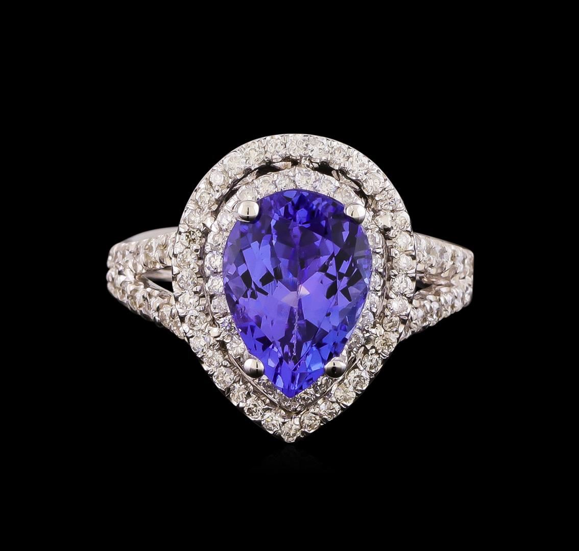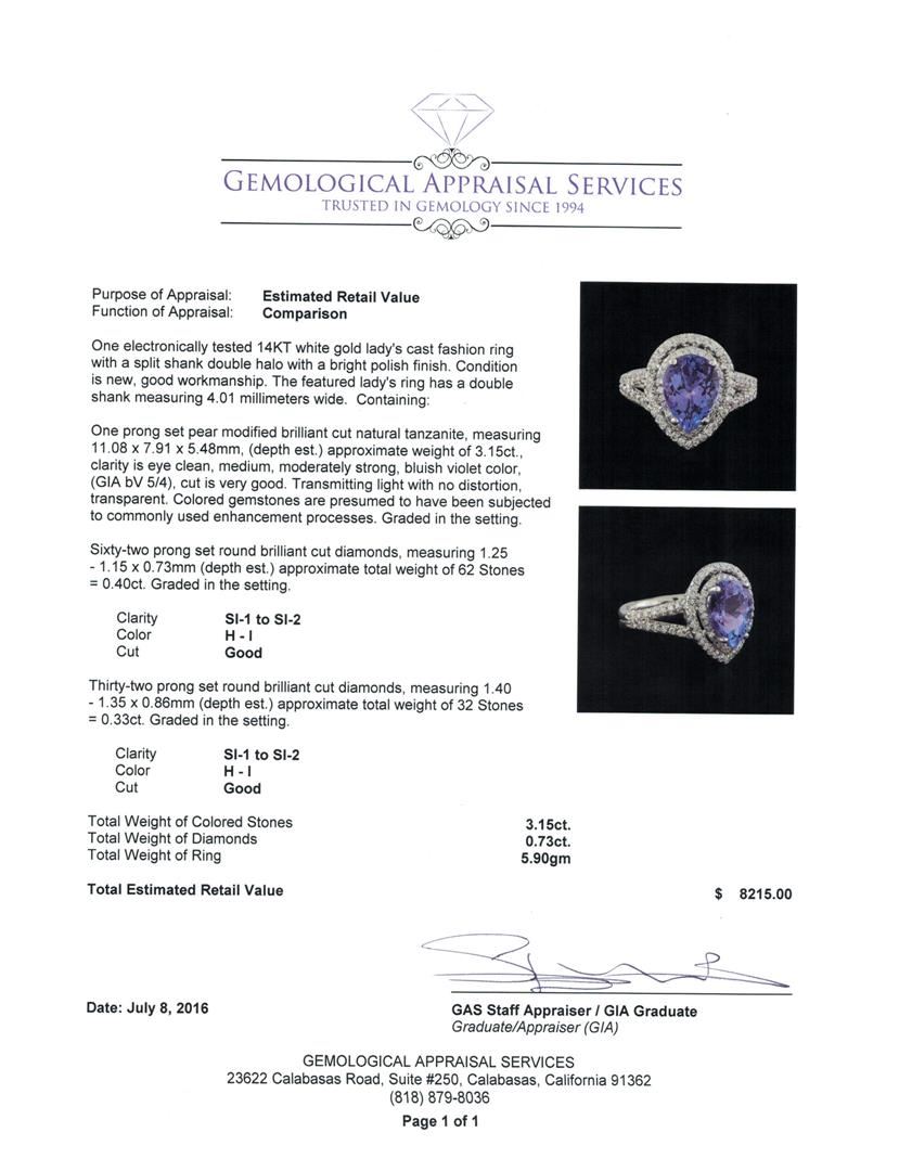 One electronically tested 14KT white gold lady's cast fashion ring with a split shank double halo with a bright polish finish. The featured lady's ring has a double shank measuring 4.01 millimeters wide. Condition is new, good workmanship. Containing: One prong set pear modified brilliant cut natural tanzanite, measuring 11.08 x 7.91 x 5.48mm, (depth est.) approximate weight of 3.15ct., clarity is eye clean, medium, moderately strong, bluish violet color, (GIA bV 5/4), cut is very good. Transmitting light with no distortion, transparent. Colored gemstones are presumed to have been subjected to commonly used enhancement processes. Graded in the setting. Sixty-Two prong set round brilliant cut diamonds, measuring 1.25 - 1.15 x 0.73mm (depth est.) approximate total weight of 62 Stones = 0.40ct. Graded in the setting. Clarity: SI-1 to SI-2. Color: H - I. Cut Good Thirty-Two prong set round brilliant cut diamonds, measuring 1.40 - 1.35 x 0.86mm (depth est.) approximate total weight of 32 Stones = 0.33ct. Graded in the setting. Clarity: SI-1 to SI-2. Color: H - I. Cut Good. Total Weight of Colored Stones 3.15ct. Total Weight of Diamonds 0.73ct. Total Weight of Ring 5.90gm. GAS Appraised at $8,215.00.