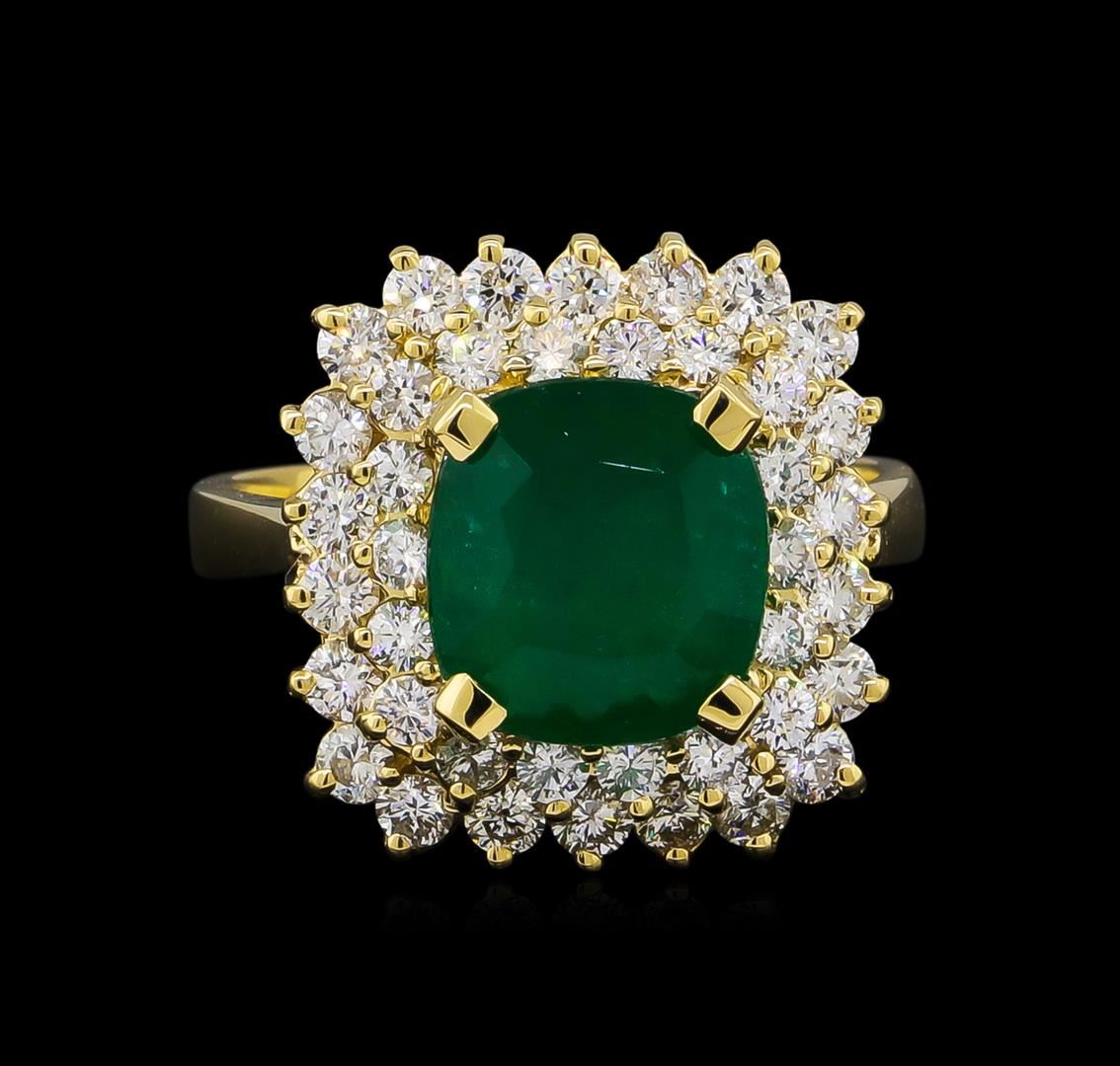 One electronically tested 14KT yellow gold lady's cast fashion ring with a basket double halo with a bright polish finish. The featured lady's ring has a shank measuring 2.90 millimeters wide. Identified with markings of "K14". Condition is new, good workmanship. Containing: One prong set square cushion modified brilliant cut natural emerald, measuring 9.70 x 9.00 x 6.04mm, approximate weight of 3.15ct., clarity is moderately included, type III, medium, strong, green color, (GIA G 5/5), cut is good. Naturally occurring internal & external characteristics are present. Indications of oil residue. Colored gemstones are presumed to have been subjected to commonly used enhancement processes. Graded in the setting. Forty-Five prong set round brilliant cut diamonds, measuring 2.10 - 1.90 x 1.20mm (depth est.) approximate. Total Weight of 45 Stones = 1.32ct. Graded in the setting. Clarity: VS-2 to SI-1. Color: G - I. Cut Very Good. Total Weight of Colored Stones 3.15ct. Total Weight of Diamonds 1.32ct. Total Weight of Ring 6.60gm. GAS Appraised at $14,085.00.