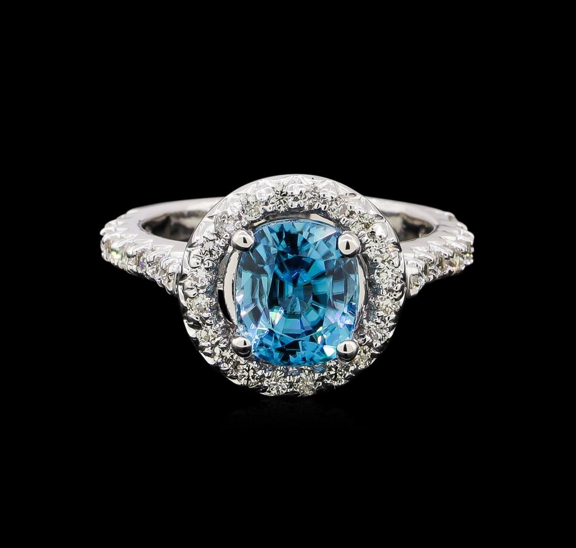One electronically tested 14KT white gold ladies cast blue zircon and diamond ring with a bright polish finish. The featured blue zircon is set within a diamond bezel supported by diamond ribbon shoulders, completed by a two millimeter wide band. Identified with markings of '14K'. Condition is new, good workmanship. Containing: One prong set rectangular cushion mixed cut natural blue zircon, measuring 8.20 x 6.80 x 5.10mm, approximate weight of 3.16ct., clarity is eye clean, type I, medium, very slightly grayish, very strongly greenish blue color, (GIA vstgB 5/3), cut is good. Transmitting light with no distortion, transparent. Graded in the setting. Sixteen prong set round brilliant cut diamonds, measuring 1.80 - 1.70 x 1.05mm (depth est.) approximate total weight of 16 Stones = 0.36ct. The clarity grade reflects the entire range of clarity for this group. Graded in the setting. Clarity SI-1 to I-2. Color: G - I Twenty prong set round brilliant cut diamonds, measuring 1.50 - 1.50 x 0.90mm (depth est.) approximate total weight of 20 Stones = 0.29ct. The clarity grade reflects the entire range of clarity for this group. Graded in the setting. Clarity SI-1 to I-2. Color: G - I. Total Weight of Colored Stones 3.16ct.. Total Weight of Diamonds 0.65ct.. Total Weight of Ring 5.30gm. AIG Appraised at $3,660.00.