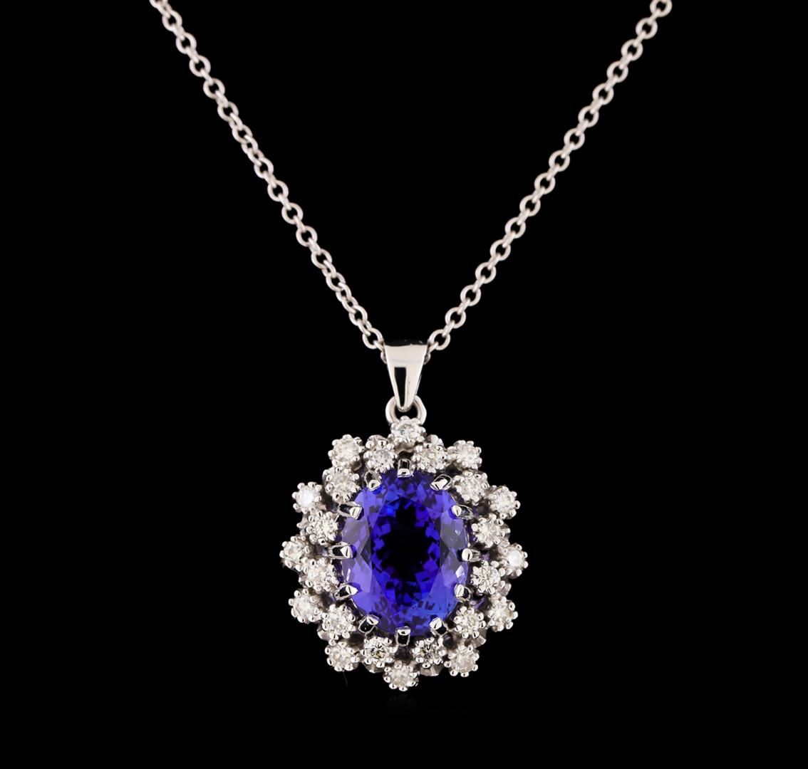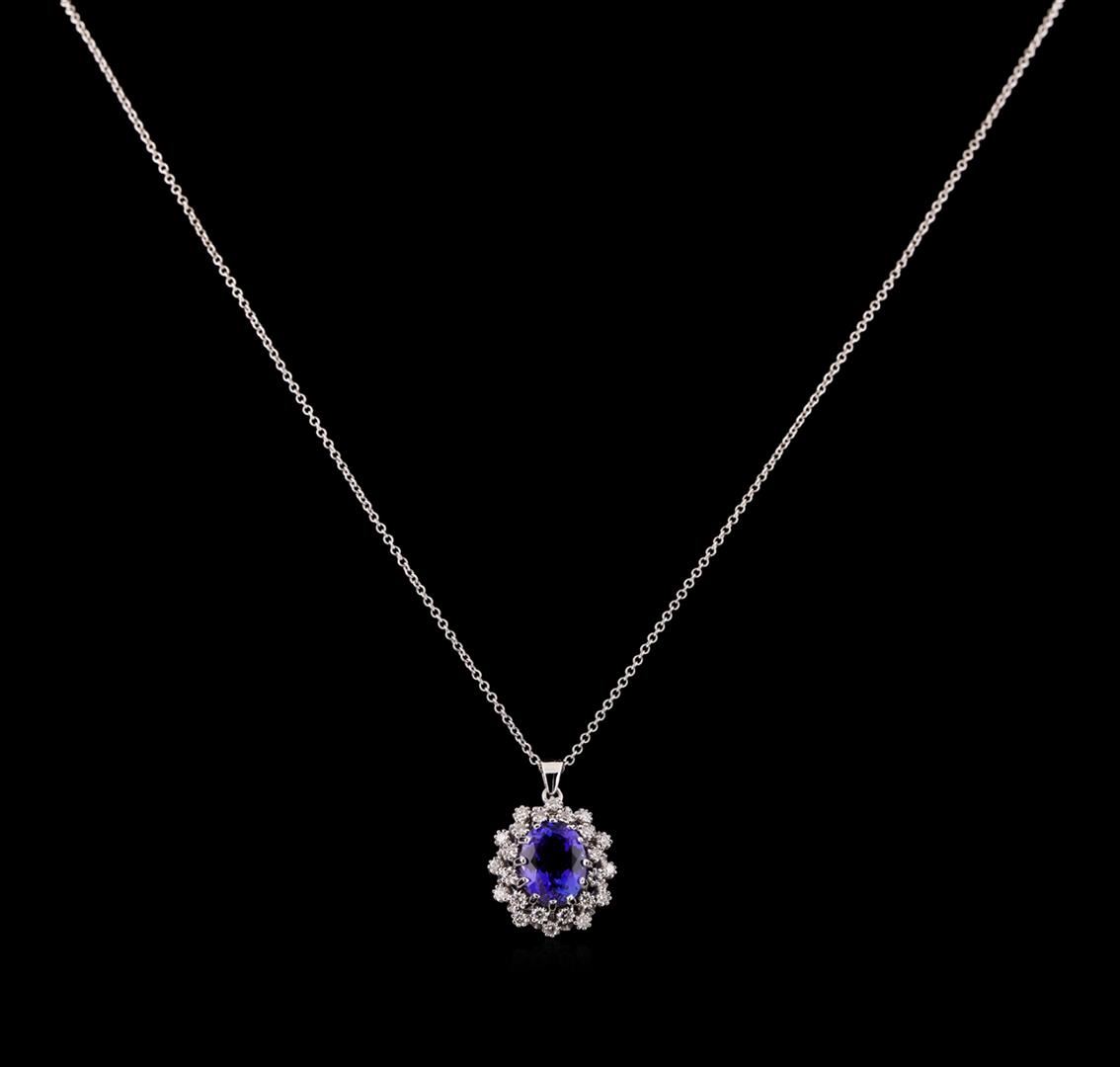 One electronically tested 14KT white gold lady's combination cast & assembled fashion pendant & chain 18.0' long, 1.3mm round cable link with a lobster claw clasp with a bright polish finish. The featured lady's pendant and chain has a drop measuring 22 millimeters in length. Identified with markings of '14K'. Condition is new, good workmanship. Containing: One prong set oval modified brilliant cut natural tanzanite, measuring 10.50 x 7.90 x 5.40mm, (depth est.) approximate weight of 3.16ct., clarity is eye clean, medium, moderately strong, bluish violet color, (GIA bV 5/4), cut is very good. Transmitting light with no distortion, transparent. Colored gemstones are presumed to have been subjected to commonly used enhancement processes. Graded in the setting. Twenty-Four prong set round brilliant cut diamonds, measuring 1.75 - 1.65 x 1.05mm (depth est.) approximate total weight of 24 Stones = 0.45ct. Graded in the setting. Clarity SI-1 to SI-2. Color: H - I Cut Good. Total Weight of Colored Stones 3.16ct.. Total Weight of Diamonds 0.45ct.. Total Weight of Pendant & Chain 5.10gm. GAS Appraised at $6,795.00.