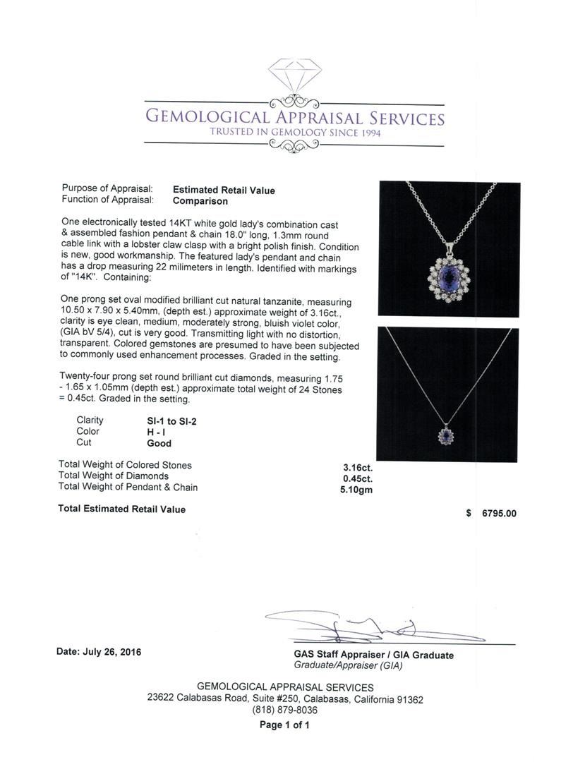 One electronically tested 14KT white gold lady's combination cast & assembled fashion pendant & chain 18.0' long, 1.3mm round cable link with a lobster claw clasp with a bright polish finish. The featured lady's pendant and chain has a drop measuring 22 millimeters in length. Identified with markings of '14K'. Condition is new, good workmanship. Containing: One prong set oval modified brilliant cut natural tanzanite, measuring 10.50 x 7.90 x 5.40mm, (depth est.) approximate weight of 3.16ct., clarity is eye clean, medium, moderately strong, bluish violet color, (GIA bV 5/4), cut is very good. Transmitting light with no distortion, transparent. Colored gemstones are presumed to have been subjected to commonly used enhancement processes. Graded in the setting. Twenty-Four prong set round brilliant cut diamonds, measuring 1.75 - 1.65 x 1.05mm (depth est.) approximate total weight of 24 Stones = 0.45ct. Graded in the setting. Clarity SI-1 to SI-2. Color: H - I Cut Good. Total Weight of Colored Stones 3.16ct.. Total Weight of Diamonds 0.45ct.. Total Weight of Pendant & Chain 5.10gm. GAS Appraised at $6,795.00.