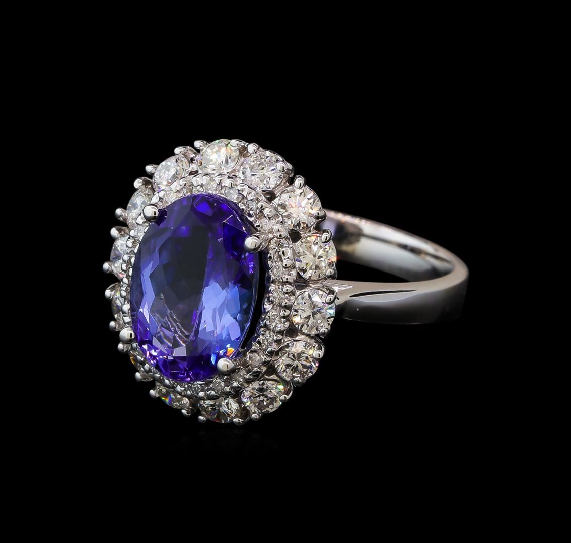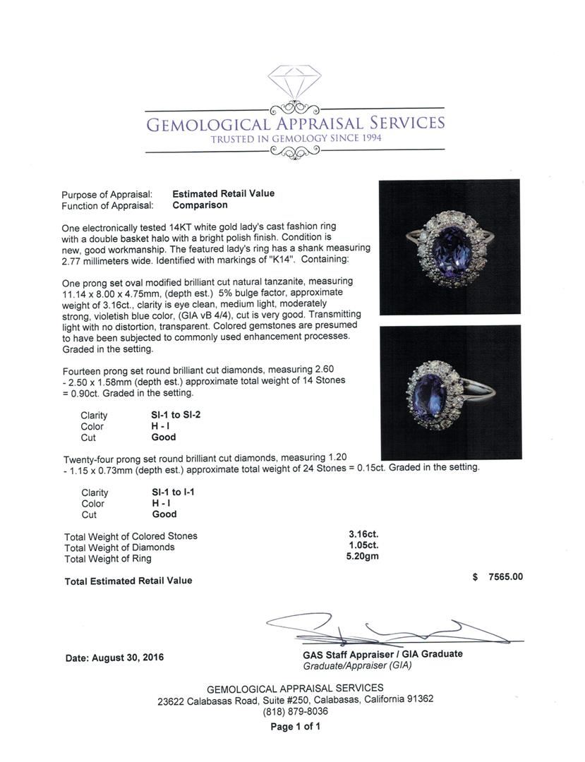 One electronically tested 14KT white gold lady's cast fashion ring with a double basket halo with a bright polish finish. The featured lady's ring has a shank measuring 2.77 millimeters wide. Identified with markings of 'K14'. Condition is new, good workmanship. Containing: One prong set oval modified brilliant cut natural tanzanite, measuring 11.14 x 8.00 x 4.75mm, (depth est.) 5%. bulge factor, approximate weight of 3.16ct., clarity is eye clean, medium light, moderately strong, violetish blue color, (GIA vB 4/4), cut is very good. Transmitting light with no distortion, transparent. Colored gemstones are presumed to have been subjected to commonly used enhancement processes. Graded in the setting. Fourteen prong set round brilliant cut diamonds, measuring 2.60 - 2.50 x 1.58mm (depth est.) approximate total weight of 14 Stones = 0.90ct. Graded in the setting. Clarity SI-1 to SI-2. Color: H - I Cut Good Twenty-Four prong set round brilliant cut diamonds, measuring 1.20 - 1.15 x 0.73mm (depth est.) approximate total weight of 24 Stones = 0.15ct. Graded in the setting. Clarity SI-1 to I-1. Color: H - I Cut Good. Total Weight of Colored Stones 3.16ct. Total Weight of Diamonds 1.05ct. Total Weight of Ring 5.20gm. GAS Appraised at $7,565.00.