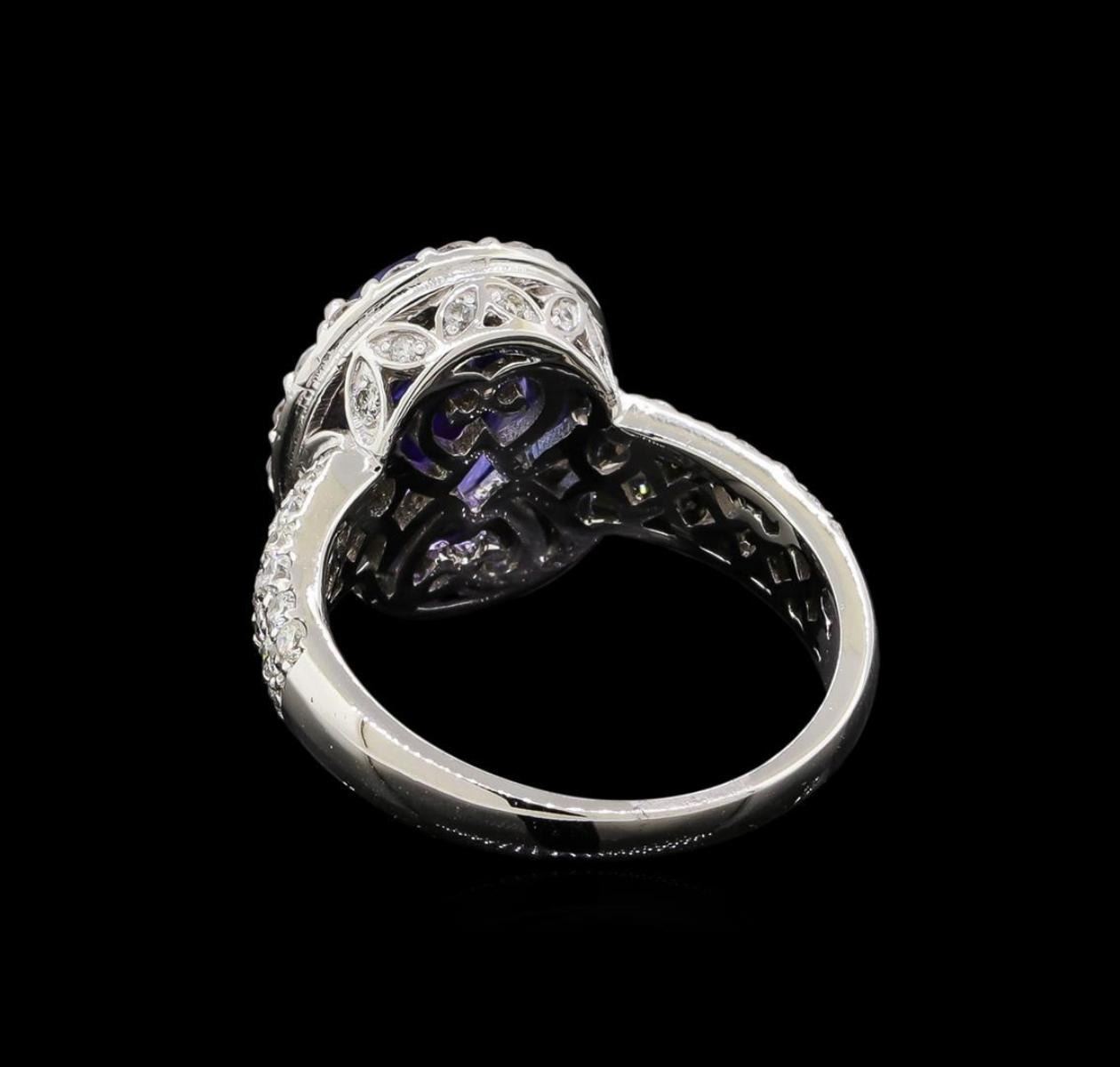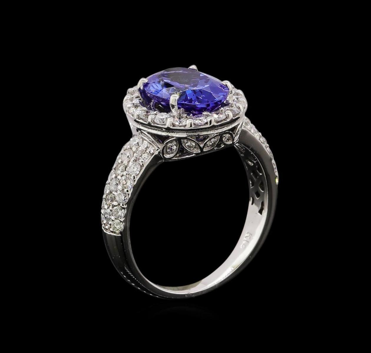 One electronically tested 14KT white gold lady's cast fashion ring with a halo with a bright polish finish. The featured lady's ring has a shank measuring 2.31 millimeters wide. Identified with markings of 'K14'. Condition is new, good workmanship. Containing: One prong set oval modified brilliant cut natural tanzanite, measuring 11.43 x 8.06 x 4.90mm, (depth est.) approximate weight of 3.16ct., clarity is eye clean, medium dark, moderately strong, violetish blue color, (GIA vB 6/4), cut is very good. Transmitting light with no distortion, transparent. Colored gemstones are presumed to have been subjected to commonly used enhancement processes. Graded in the setting. Eighteen prong set round brilliant cut diamonds, measuring 1.90 - 1.85 x 1.17mm (depth est.) approximate total weight of 18 Stones = 0.46ct. Graded in the setting. Clarity SI-1 to I-1. Color: G - I Cut Good Thirty-Six prong set round brilliant cut diamonds, measuring 1.60 - 1.50 x 0.96mm (depth est.) approximate total weight of 36 Stones = 0.52ct. Graded in the setting. Clarity SI-1 to I-1. Color: G - H Cut Good Twelve prong set round brilliant cut diamonds, measuring 1.30 - 1.25 x 0.79mm (depth est.) approximate total weight of 12 Stones = 0.10ct. Graded in the setting. Clarity SI-1 to I-1. Color: H - I Cut Good. Total Weight of Colored Stones 3.16ct.. Total Weight of Diamonds 1.08ct.. Total Weight of Ring 5.90gm.